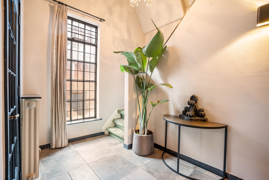 U komt binnen via de overdekte entree. De vestibule met garderobe leidt naar een royale hal met vide en bordestrap. Er worden charmante originele details gevonden, zoals het hoge glas-in-loodraam. In 2018 is het toilet gemoderniseerd. Ook bereikt u vanuit de hal de provisiekelder/wijnkelder van ca. 13 m², waar ook de aansluitingen zijn voor de wasmachine en droger.
