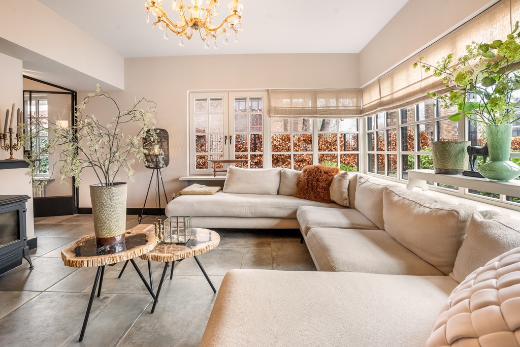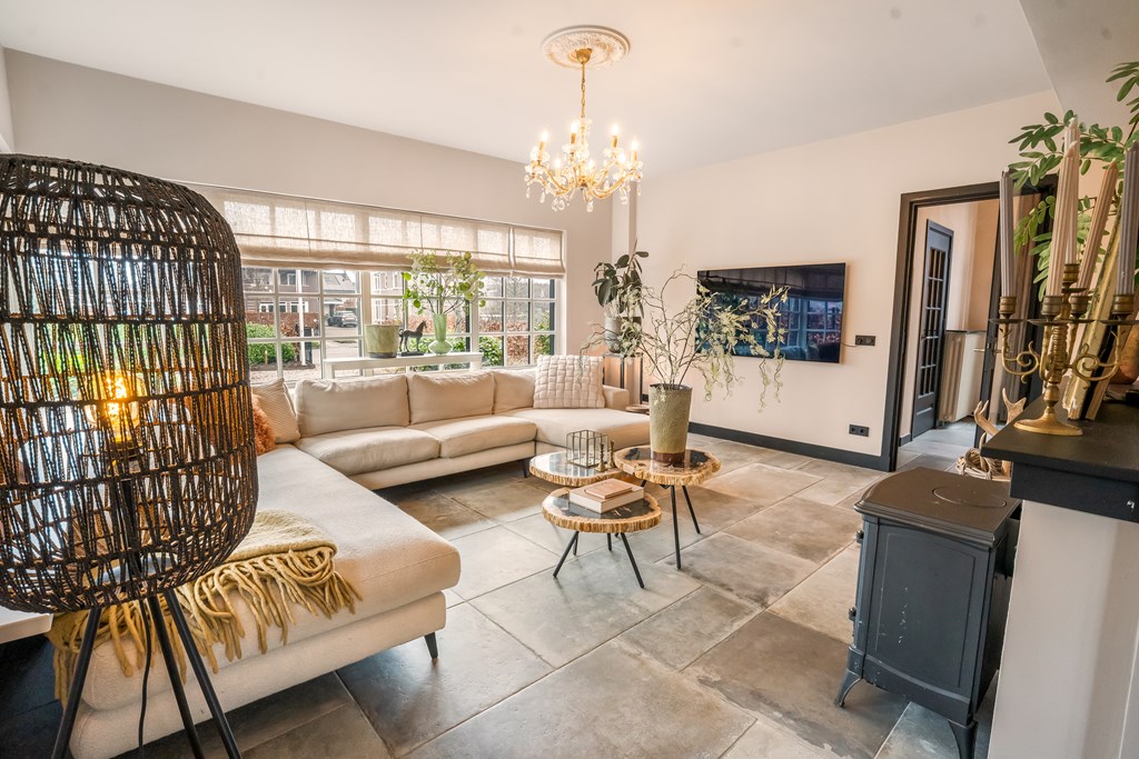 De sfeervolle woonkamer-en-suite van ca. 55 m² is heerlijk licht, voorzien van een gezellige houtkachel en vernieuwde kozijnen met roedeverdeling. Alle wanden en het plafond zijn in 2025 strak gestuct en geschilderd. Vanuit de eetkamer kijkt u vrijuit over de fraaie tuin met als eyecatcher de ruime en moderne veranda met bar en houtkachel. In de eetkamer is ruimte voor een grote familietafel en deze ruimte beschikt over een gashaard voor extra warmte en sfeer. Op de gehele begane grond is een prachtige nieuwe tegelvloer aangebracht.