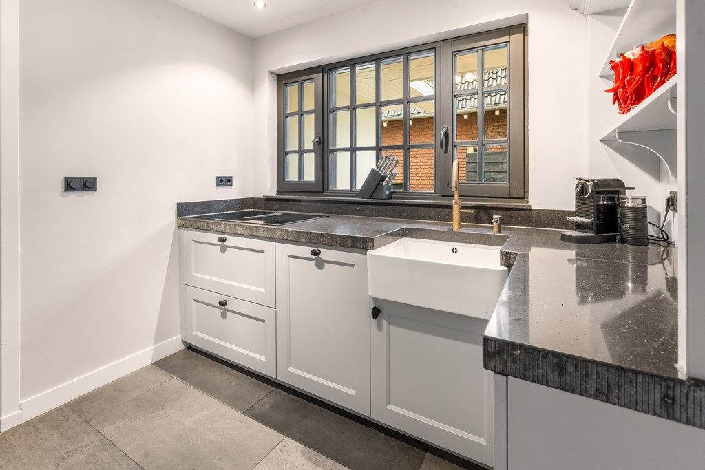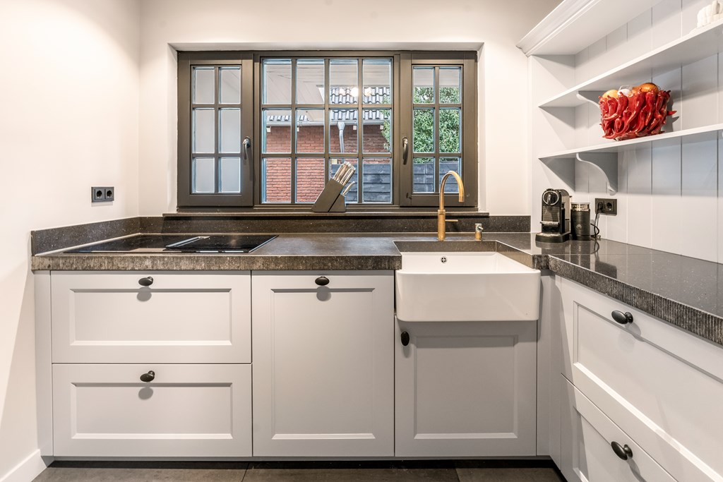 De in 2021 vernieuwde keuken is voorzien van een inductie kookplaat, oven, magnetron, vaatwasser, koelkast en een Quooker. Vanuit de keuken bereikt u de bijkeuken met praktische wandkasten, de cv-combiketel (Nefit uit 2021) en de meterkast.