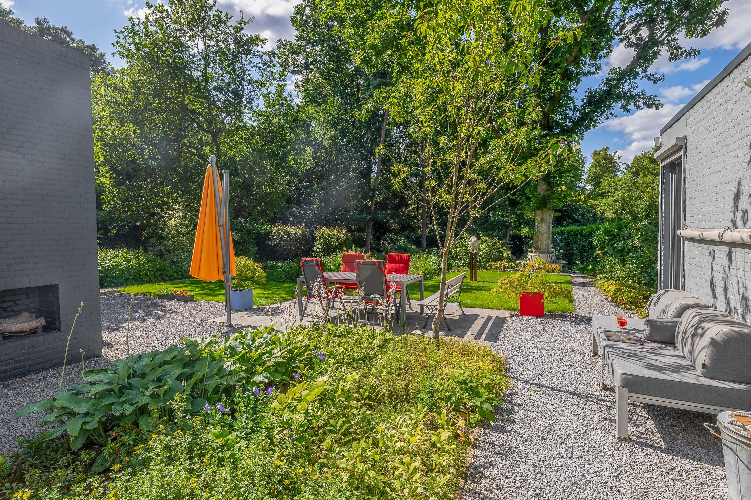 De achtertuin is een ware oase van privacy en rust. Je waant je hier letterlijk in een park omringd door volwassen groen en midden in de natuur. De tuin is rondom afgeschermd door een laurierhaag.. Hier zijn meerdere stroompunten en buitenkraantjes aanwezig, en voor gezellige avonden is er een buitenhaard te vinden! Het geheel is prachtig aangelegd met groot gazon, beplanting en een fraaie vijver. Natuurlijk mag een computergestuurde beregeningsinstallatie hier niet ontbreken. Een prachtige aangelegde tuin met walnotenboom, magnolia's en ook veel bosvruchten: blauwe bessen (25 kg per jaar), bramen en frambozen.