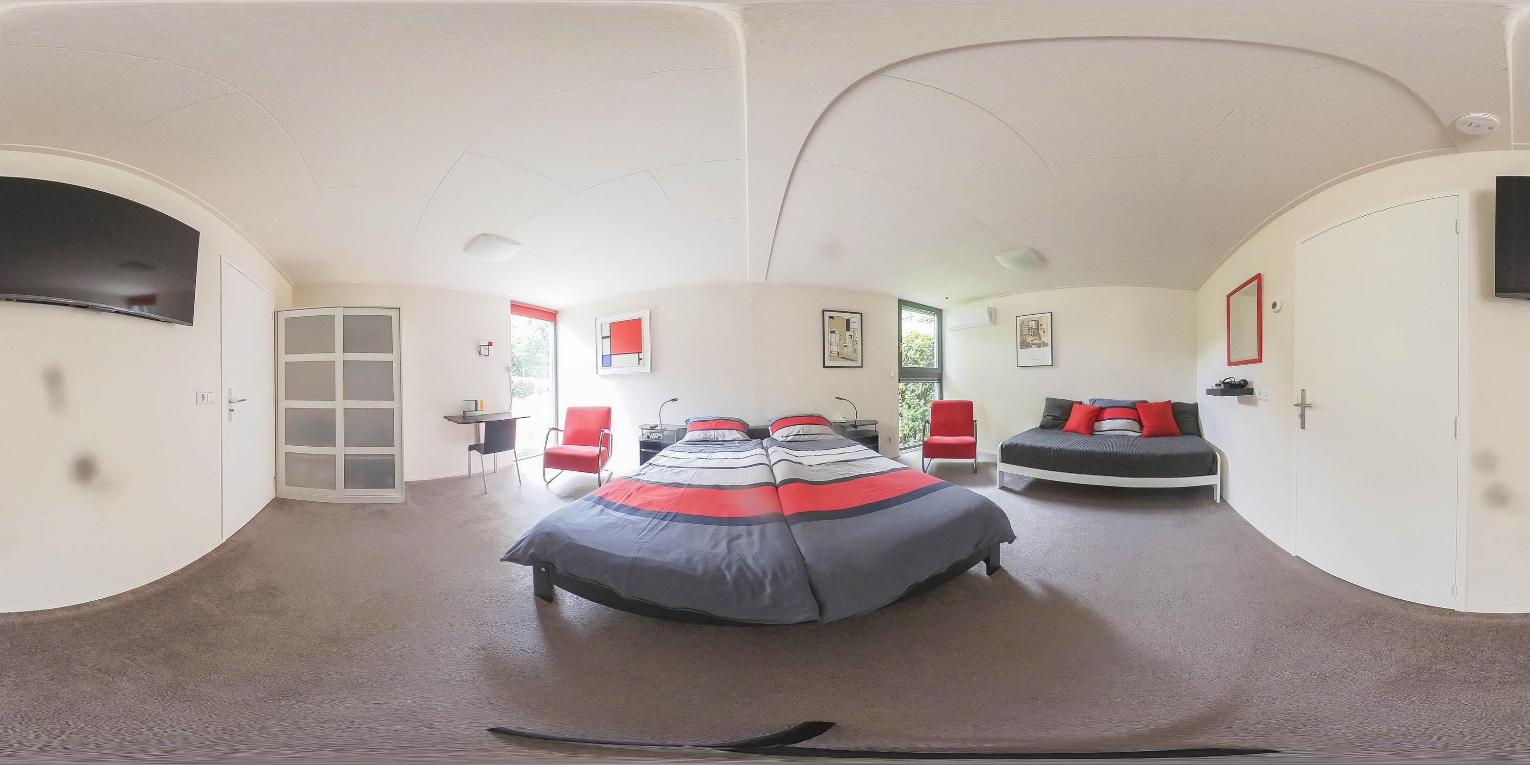 De ruime slaapkamer 1 is afgewerkt met stucwerkwanden en -plafond en vloerbedekking. Dankzij de draai-kiepramen stroomt het natuurlijke licht hier rijkelijk naar binnen; sommige ramen zijn voorzien van een hor en/of
