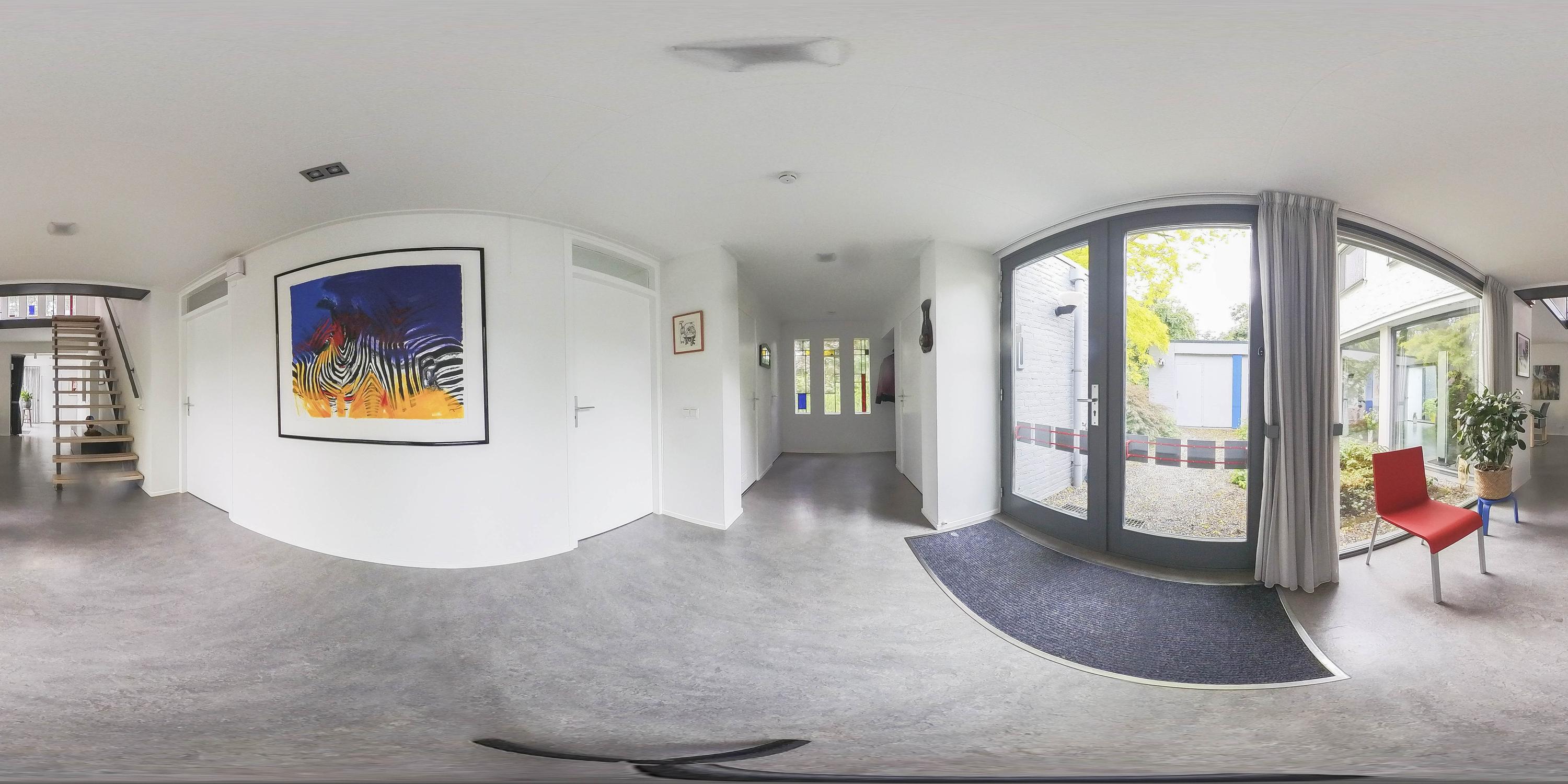 Je betreedt de woning via een royale, open entreehal met dubbele deuren. Deze beschikt over veel natuurlijke lichtinval dankzij de grote raampartijen.