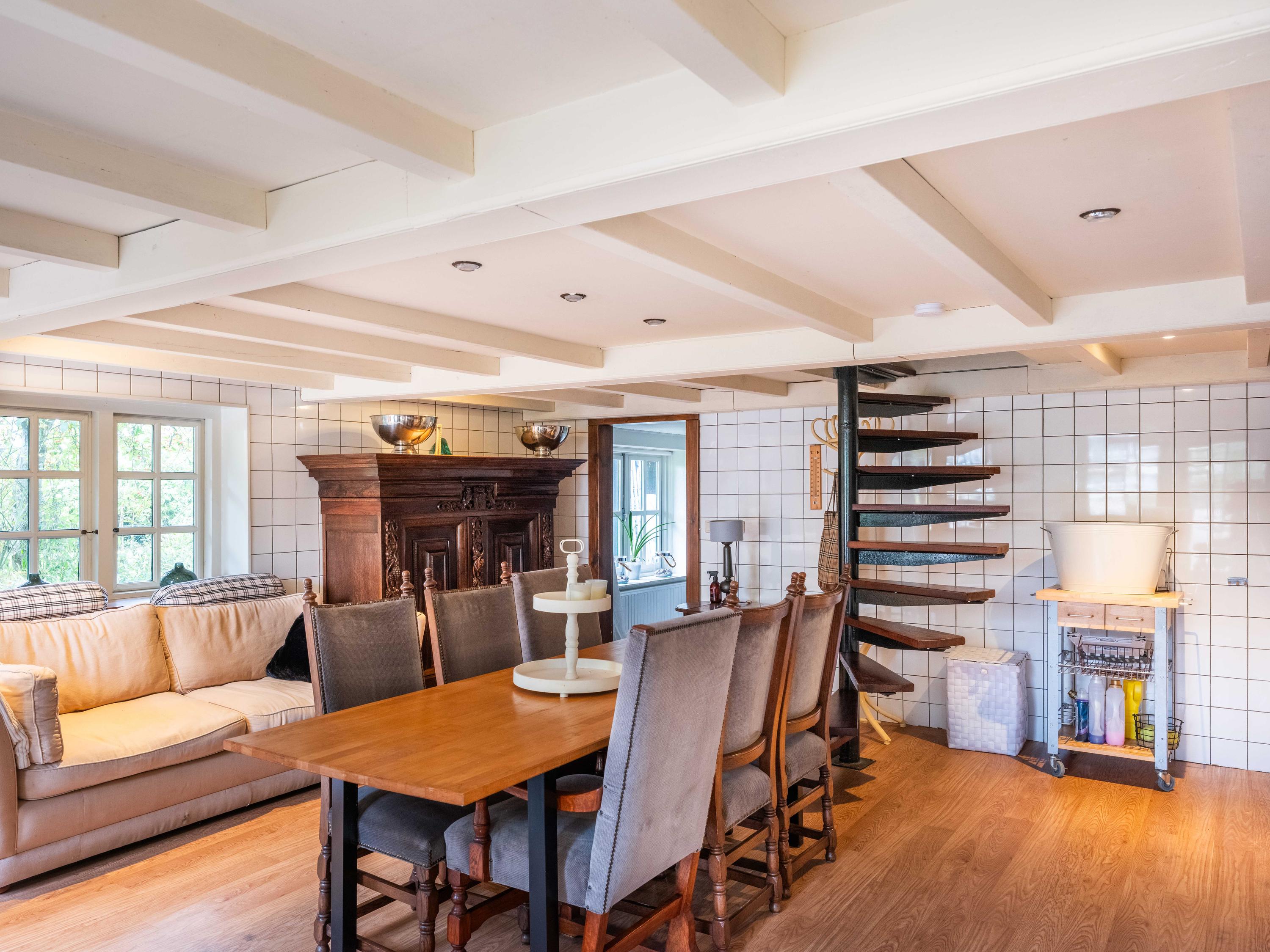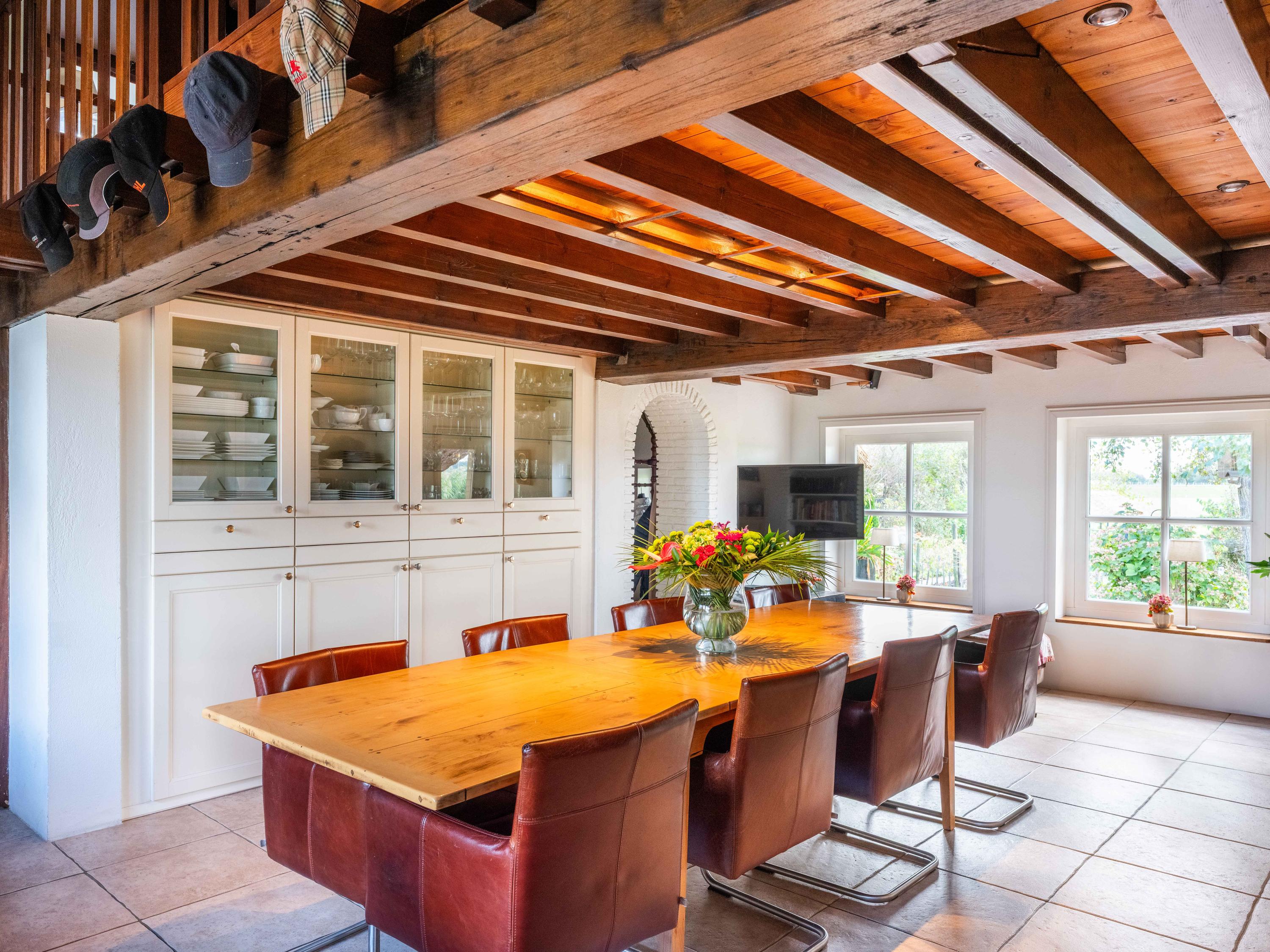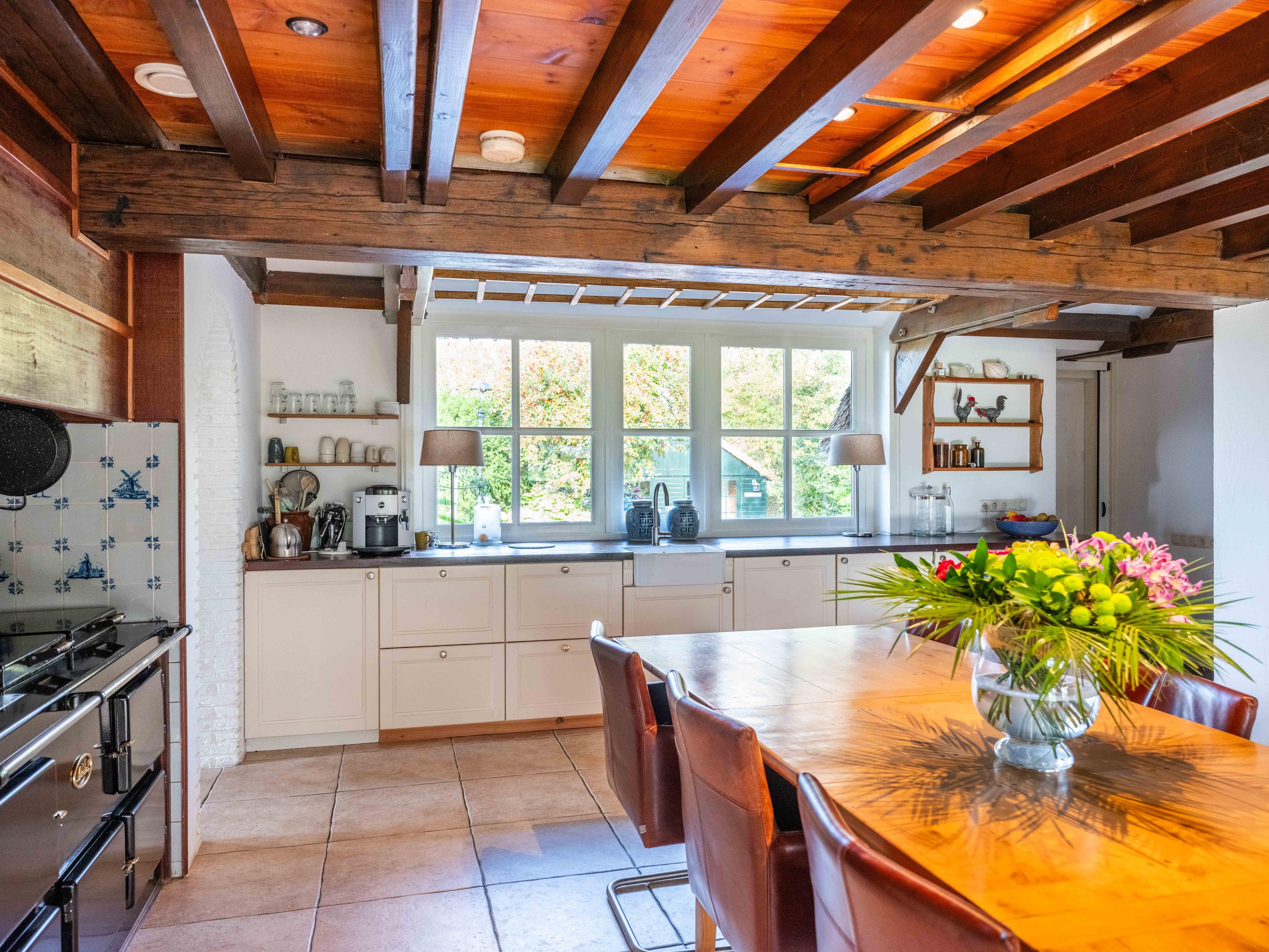 Via de hal met garderoberuimte en bergkast bereik je het toilet met fonteintje en de trap naar de eerste verdieping. Vanuit de hal stap je direct door naar de gezellige eetruimte met open keuken. De grote ramen bieden een prachtig zicht op de groene tuin rondom. De landelijke keuken is voorzien van vaste kasten en volop bergruimte. Vanuit hier is er tevens toegang tot de ruime kelder, ideaal voor voorraad of als wijnkelder. De royale woonkeuken vormt het hart van het huis, met authentieke details zoals een Engelse fornuis met vier ovens en karakteristieke balkenplafonds.