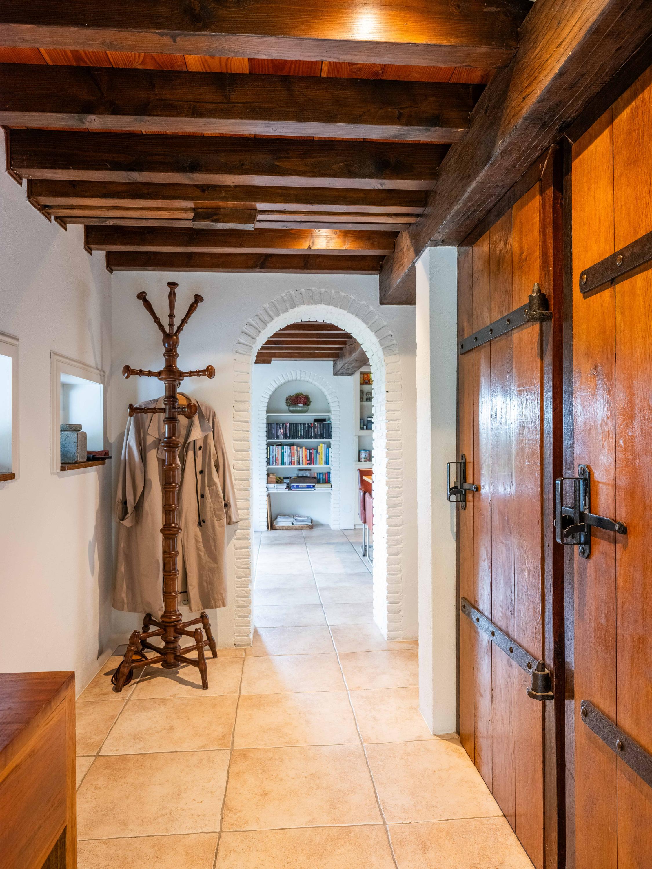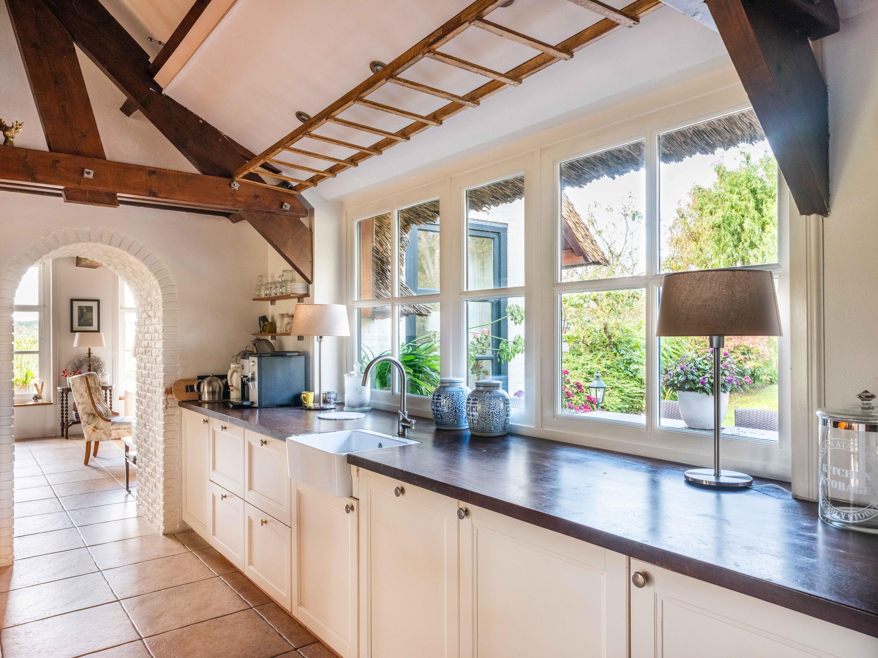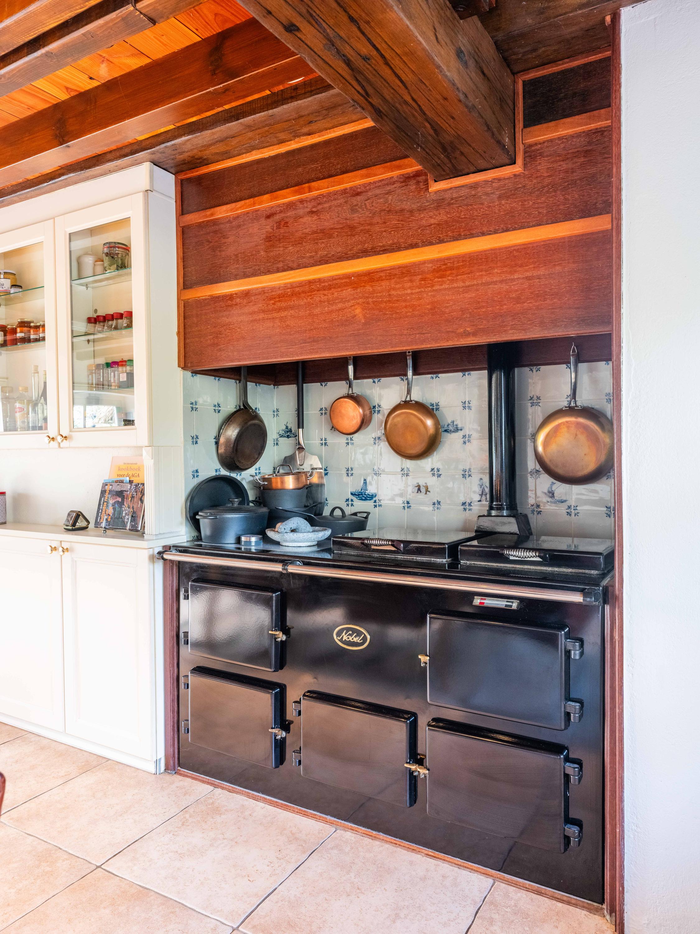 Via de hal met garderoberuimte en bergkast bereik je het toilet met fonteintje en de trap naar de eerste verdieping. Vanuit de hal stap je direct door naar de gezellige eetruimte met open keuken. De grote ramen bieden een prachtig zicht op de groene tuin rondom. De landelijke keuken is voorzien van vaste kasten en volop bergruimte. Vanuit hier is er tevens toegang tot de ruime kelder, ideaal voor voorraad of als wijnkelder. De royale woonkeuken vormt het hart van het huis, met authentieke details zoals een Engelse fornuis met vier ovens en karakteristieke balkenplafonds.