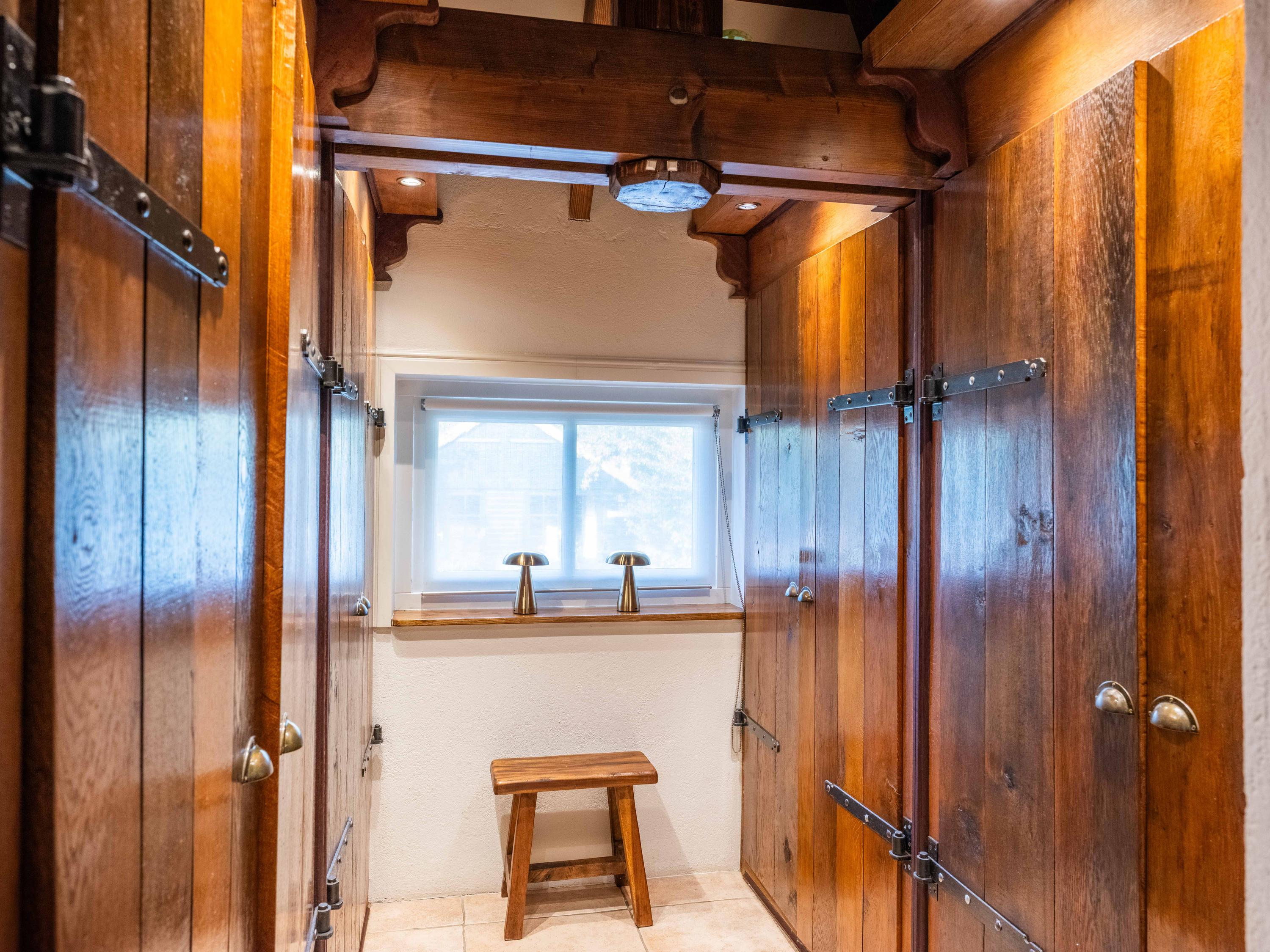 Aangrenzend aan de keuken bevindt zich de luxe badkamer, uitgerust met een ligbad, inloopdouche, toilet en dubbele wastafel. Tegenover de badkamer is een ruimte gelegen met kastruimte voor leg- en hangkleding. Daarnaast loopt de keuken aan de andere zijde over in de sfeervolle zitkamer, waar het vele licht en het uitzicht op het water direct opvallen. Deze ruimte is ruim en erg gezellig, mede door de houtkachel die voor warmte en sfeer zorgt. De gehele benedenverdieping is voorzien van comfortabele vloerverwarming.