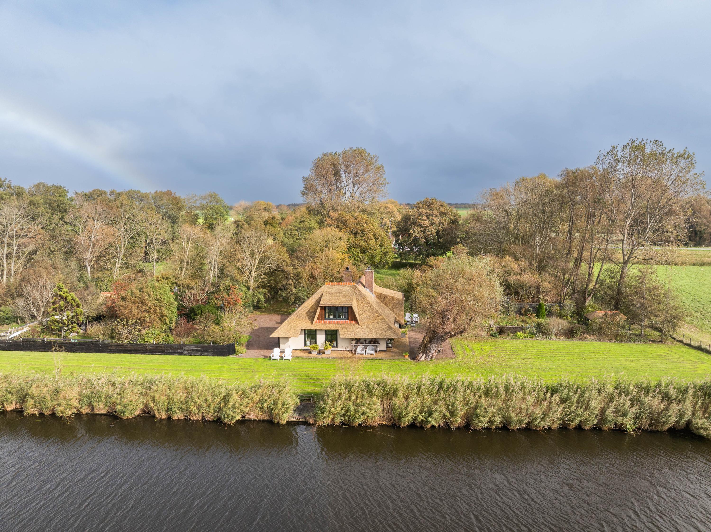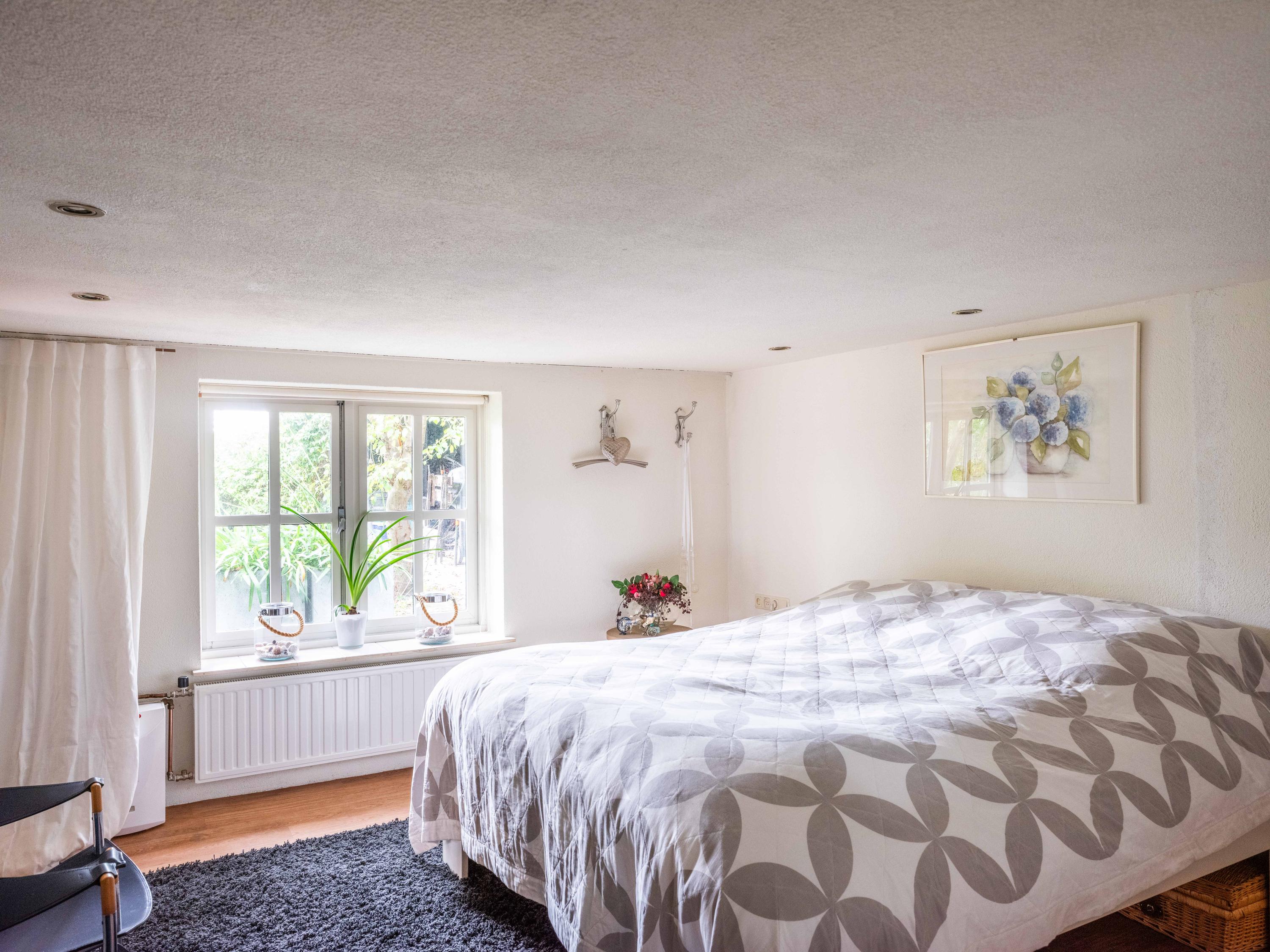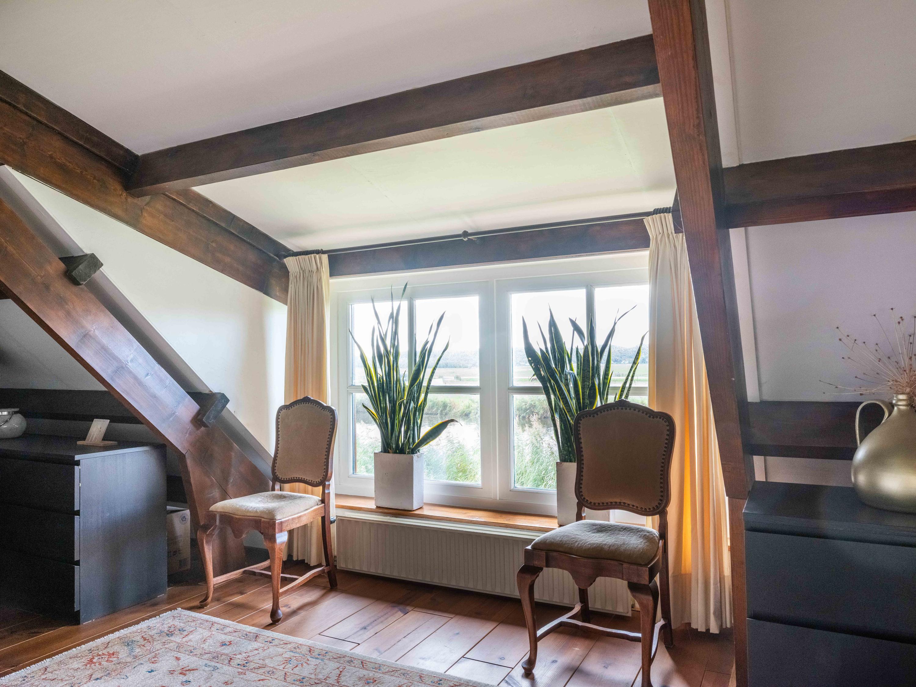 De trap leidt naar een ruime open vide met zicht op de keuken beneden. Deze ruimte doet momenteel dienst als werk- en logeerruimte en heeft uitzicht op de tuin rondom. Via de open doorgang bereik je de royale slaapkamer met een adembenemend uitzicht over de tuin, het water en de uitgestrekte weilanden.