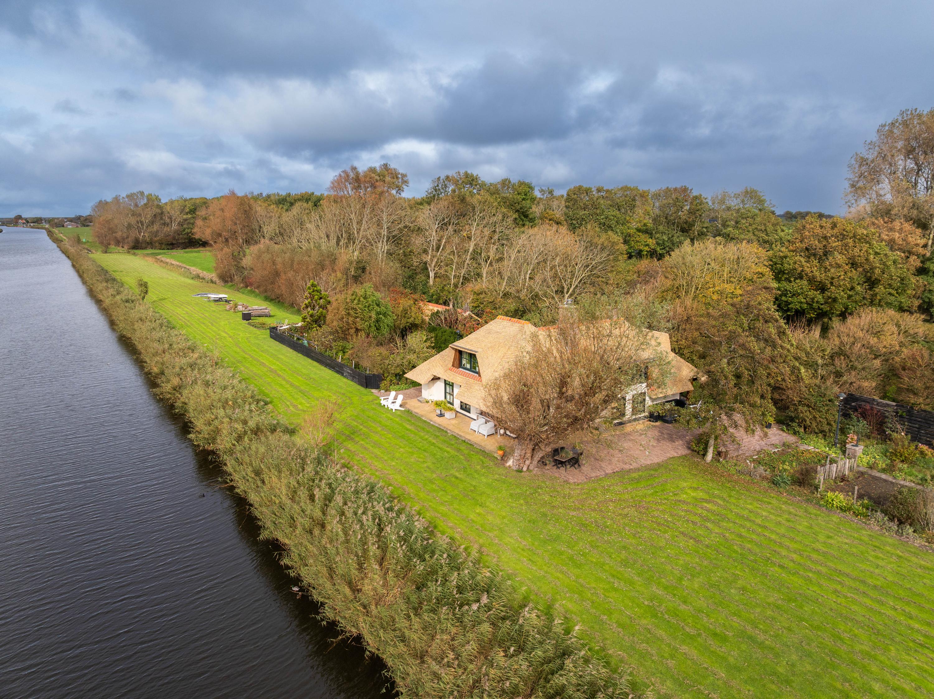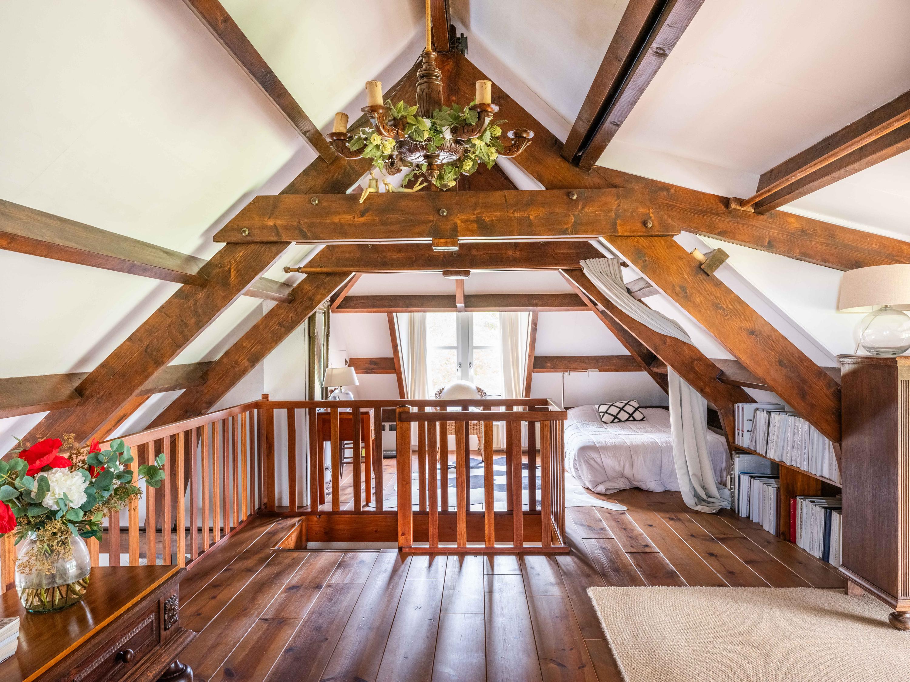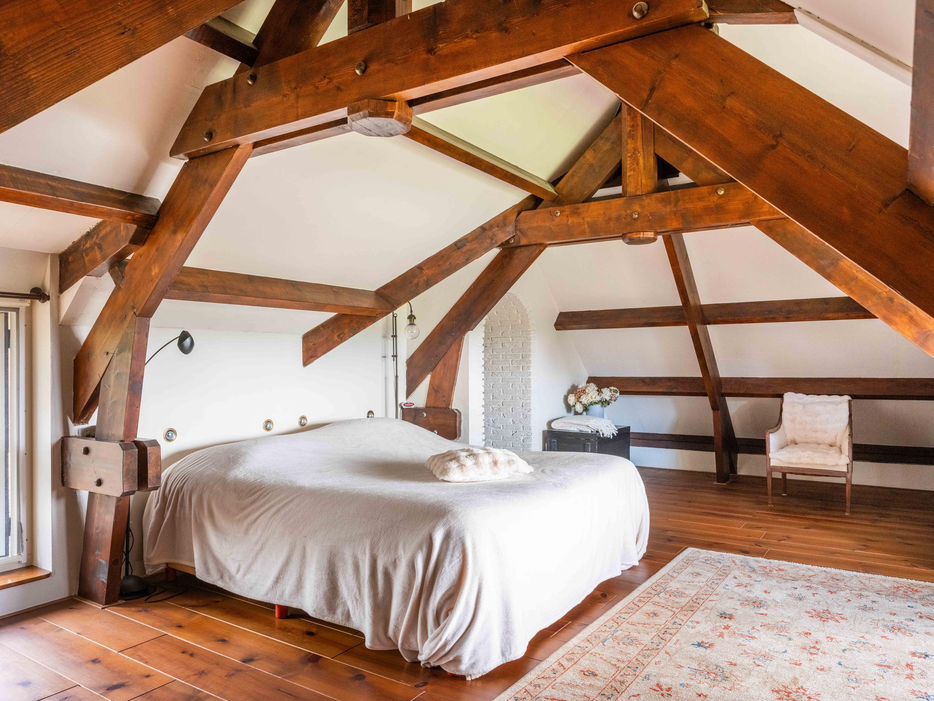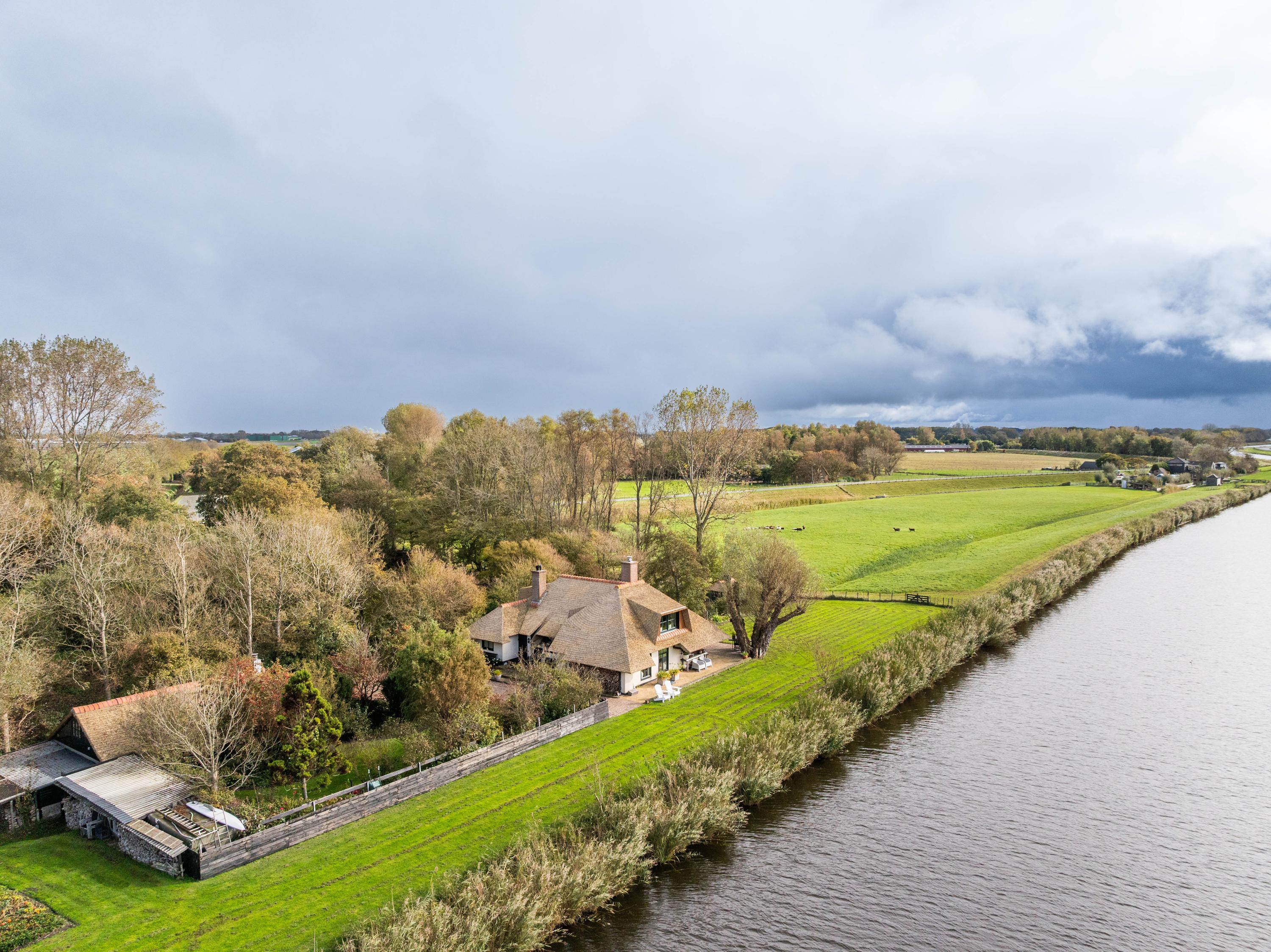 De trap leidt naar een ruime open vide met zicht op de keuken beneden. Deze ruimte doet momenteel dienst als werk- en logeerruimte en heeft uitzicht op de tuin rondom. Via de open doorgang bereik je de royale slaapkamer met een adembenemend uitzicht over de tuin, het water en de uitgestrekte weilanden.