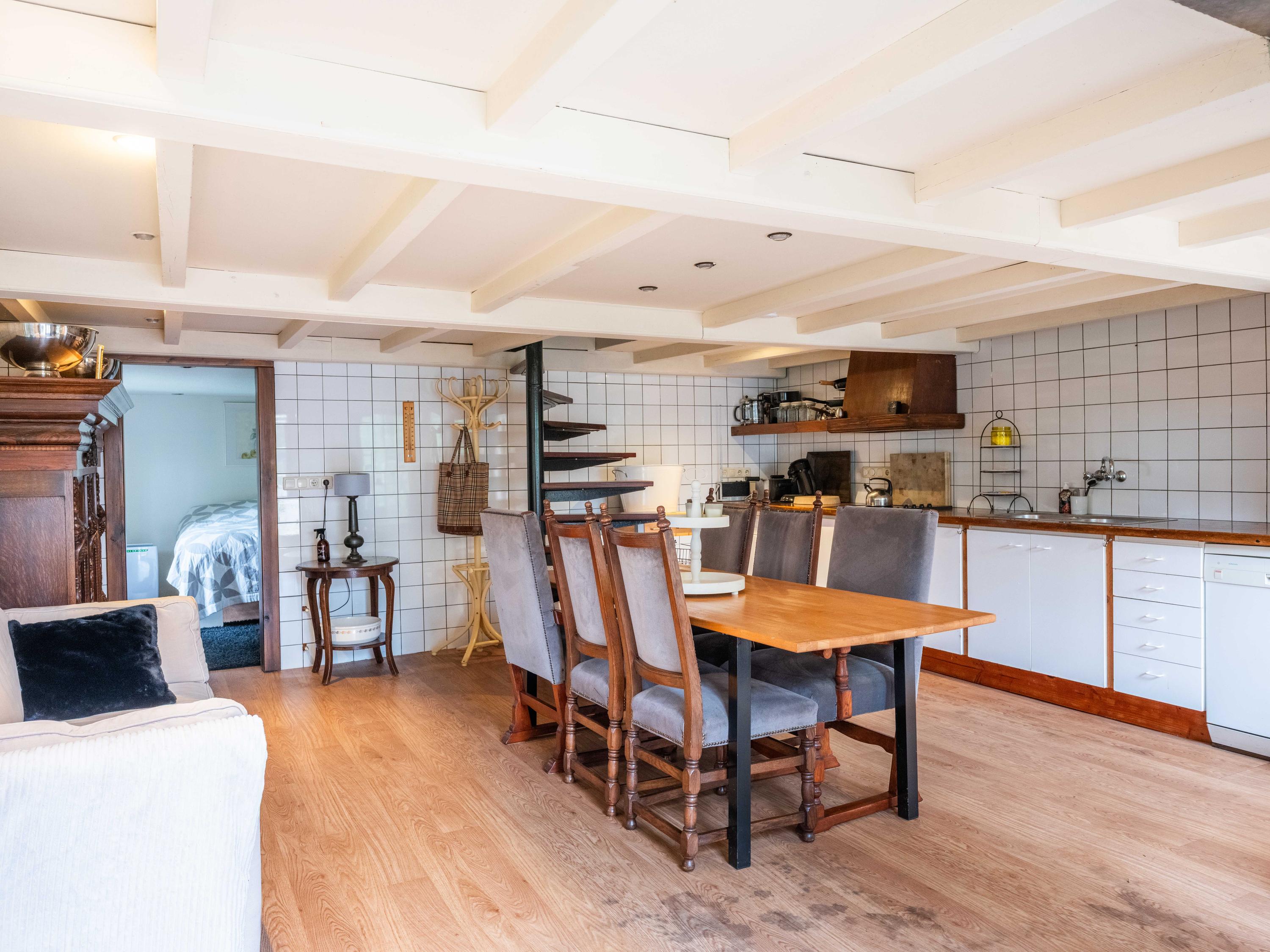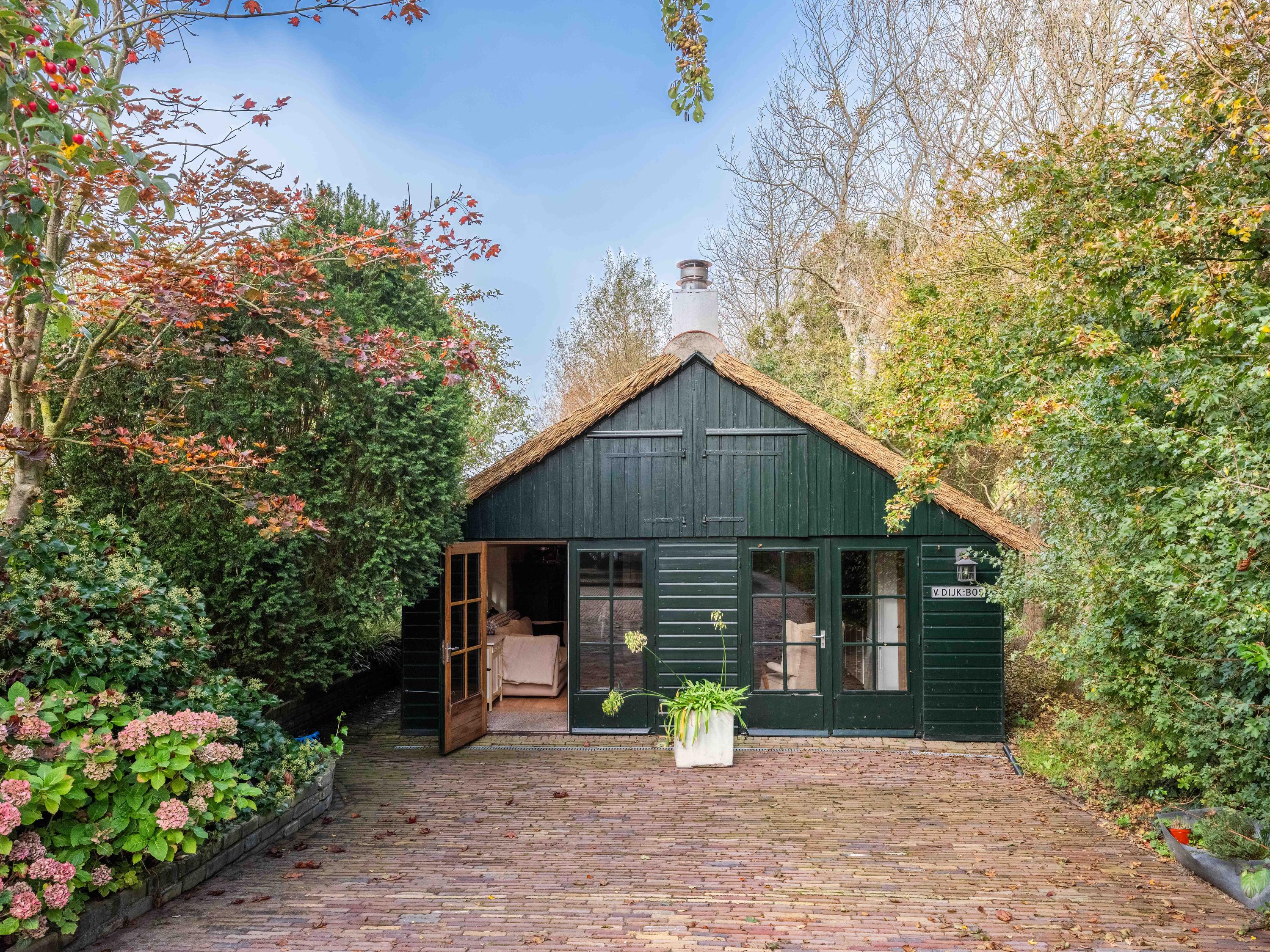 In de fraai aangelegde tuin bevindt zich een volledig ingericht gastenverblijf met een eigen houtkachel, open keuken met complete apparatuur, wasmachine en droger, eetruimte en radiatoren. Let op het sfeervolle lage plafond. De slaapkamer beschikt over een eigen douche, terwijl er ook een separaat toilet met wastafel aanwezig is. Boven biedt een zolder extra bergruimte.