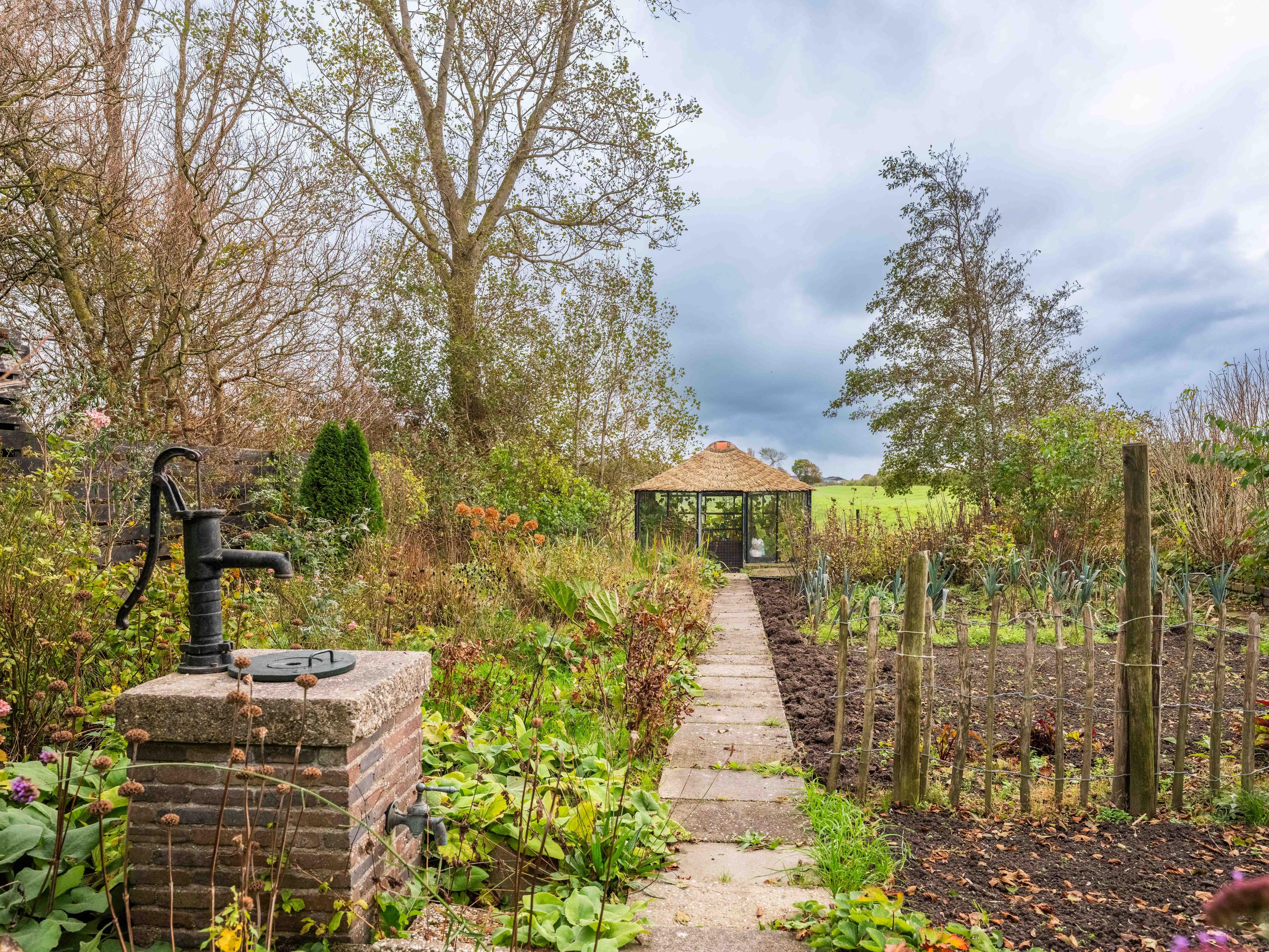 De tuin zelf ademt rust en natuur: een groene oase met meerdere terrassen, fruitbomen, moestuin en een steiger aan het water, een heerlijke plek om te ontspannen en te genieten van de stilte en het weidse uitzicht.