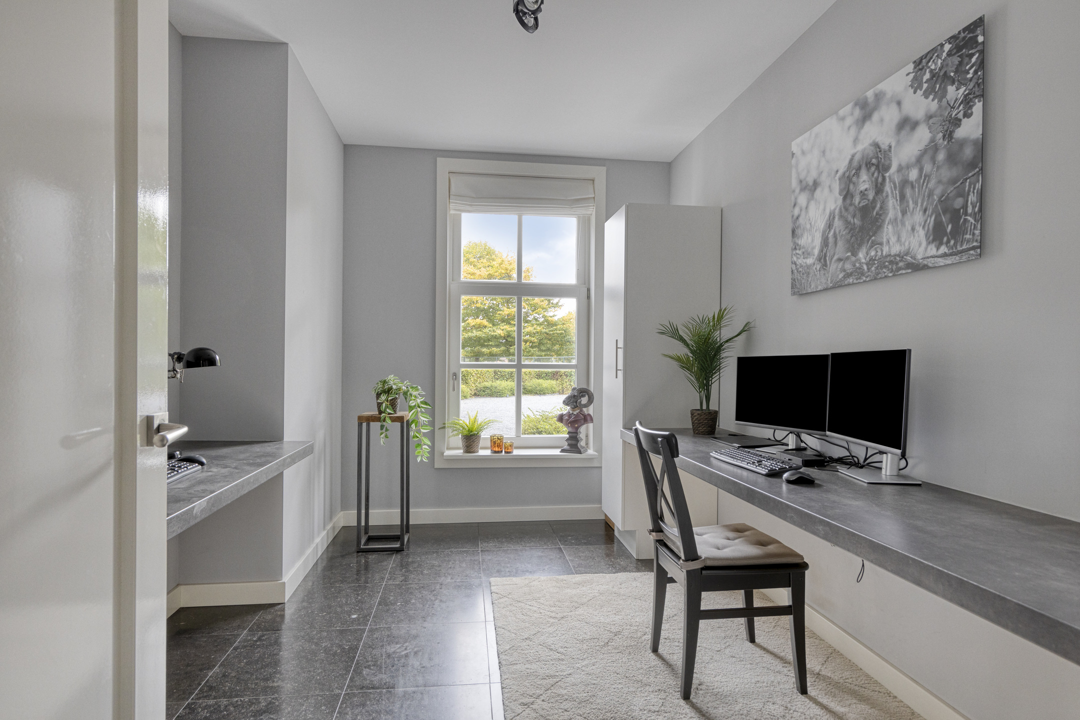 Werk-/speelkamer: wanden gestuct, natuurstenen vloer, plafond gestuct.