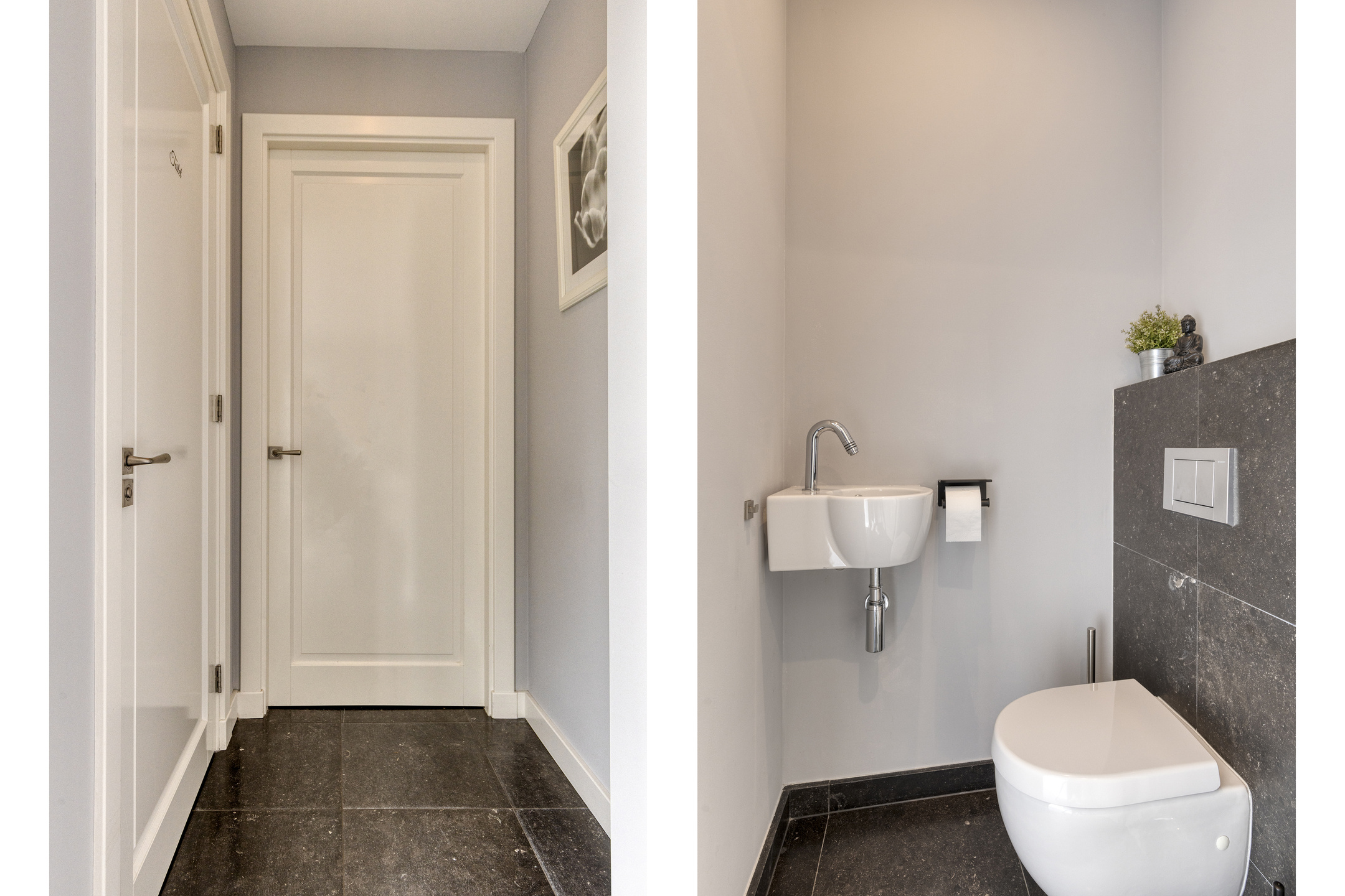 Toilet: separaat; met wandcloset en fonteintje. Wanden gestuct en afgewerkt met natuursteen.
