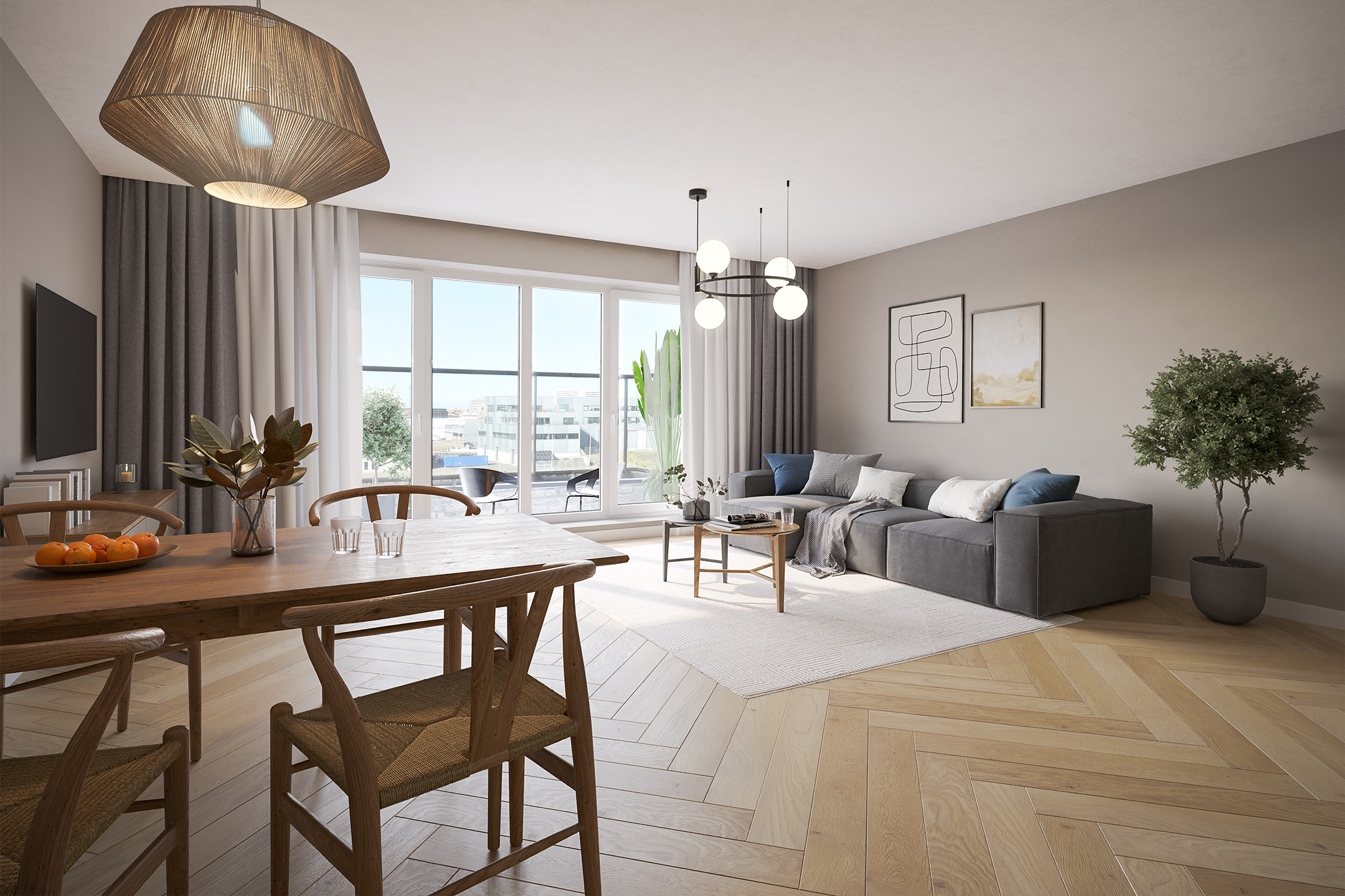 开放式起居空间以NEXT-125厨房为核心,配备复合台面与集成家电,包括Quooker龙头、带内置排风的感应炉灶以及组合烤箱。全屋地暖与制冷系统贯通每个空间,能源效率达A+++级。除技术间外,所有房间皆舒适宜人。南向后阳台俯瞰共用庭院,为居者带来静谧时光,且两间卧室均可直达。