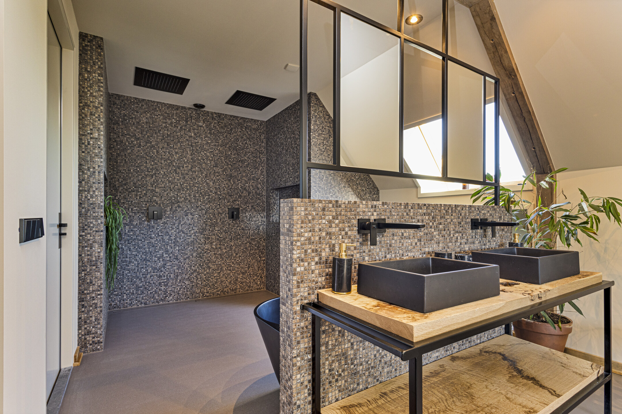 庄园内部将庄重的历史风貌与当代材料巧妙结合。勃艮第老石灰华、大面积上油橡木、精致亚麻墙布与精心复原的地板共存,现代便利设施如空调、地暖和太阳能板融入其中。三间卧室配备静谧主套房,含双头雨林花洒、独立浴缸和设有火焰木门的步入式衣帽间。空间开放明亮,推拉门串联起音乐厅、花园与朝向河流和自然光线的露台。