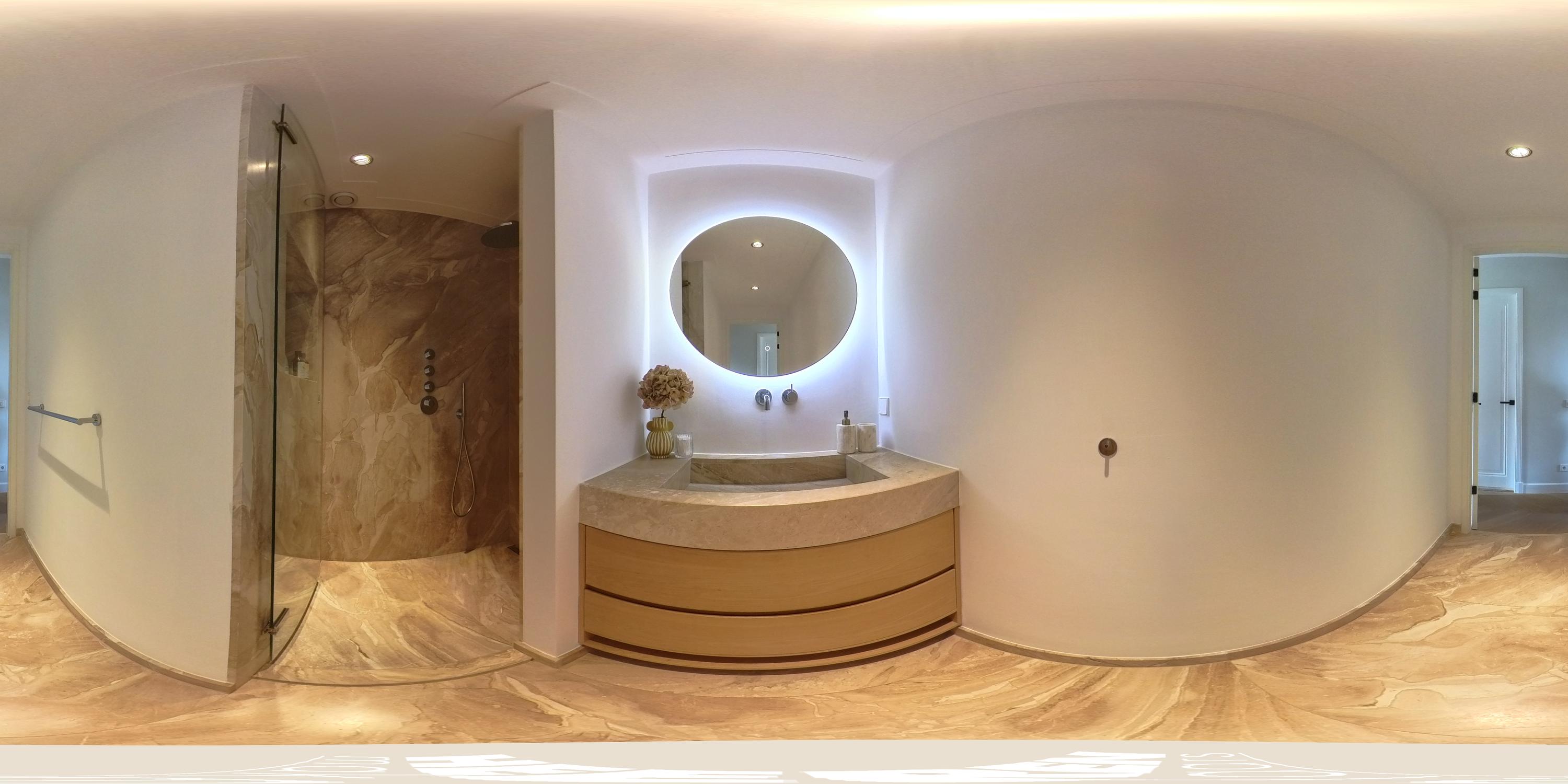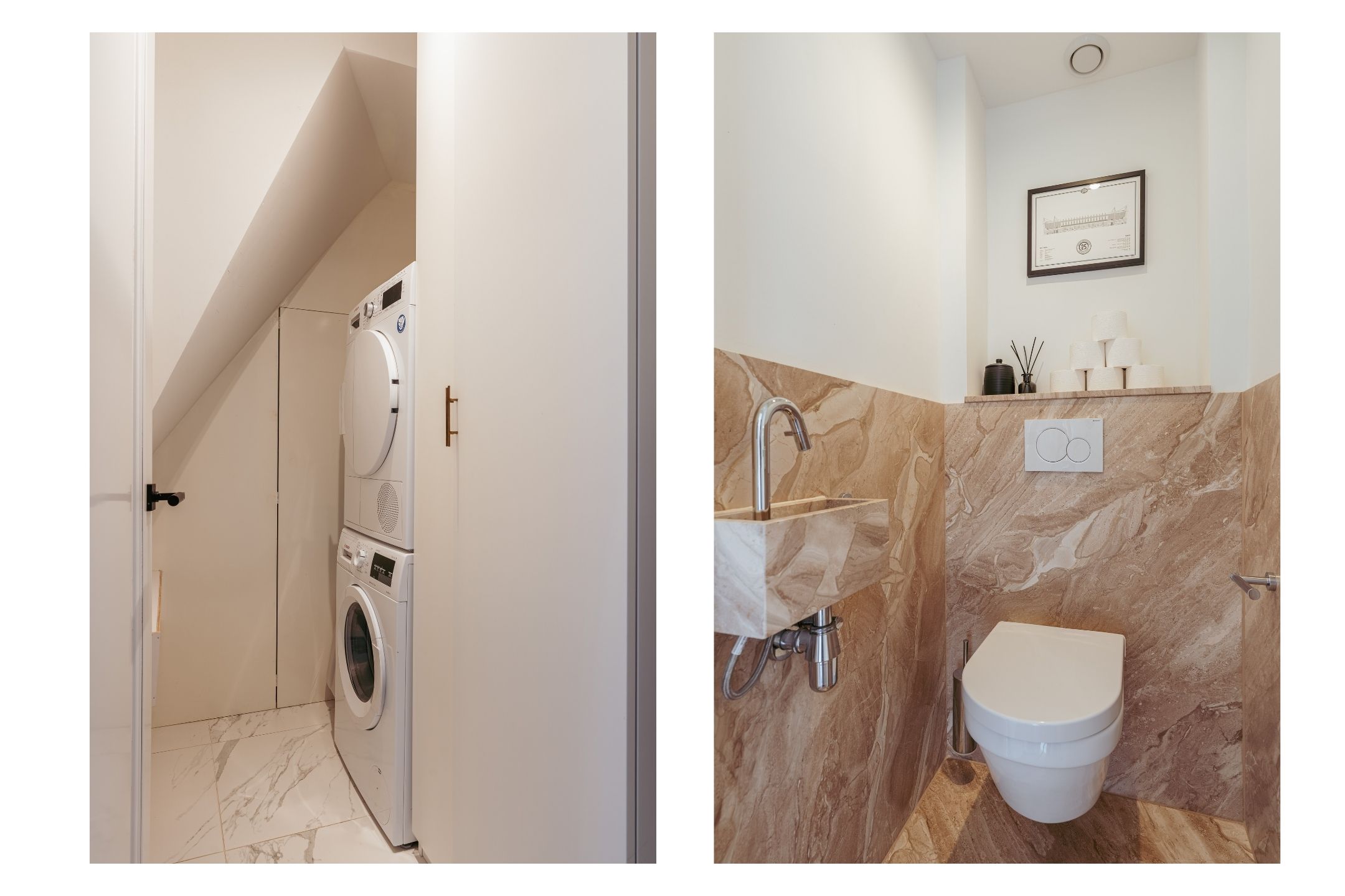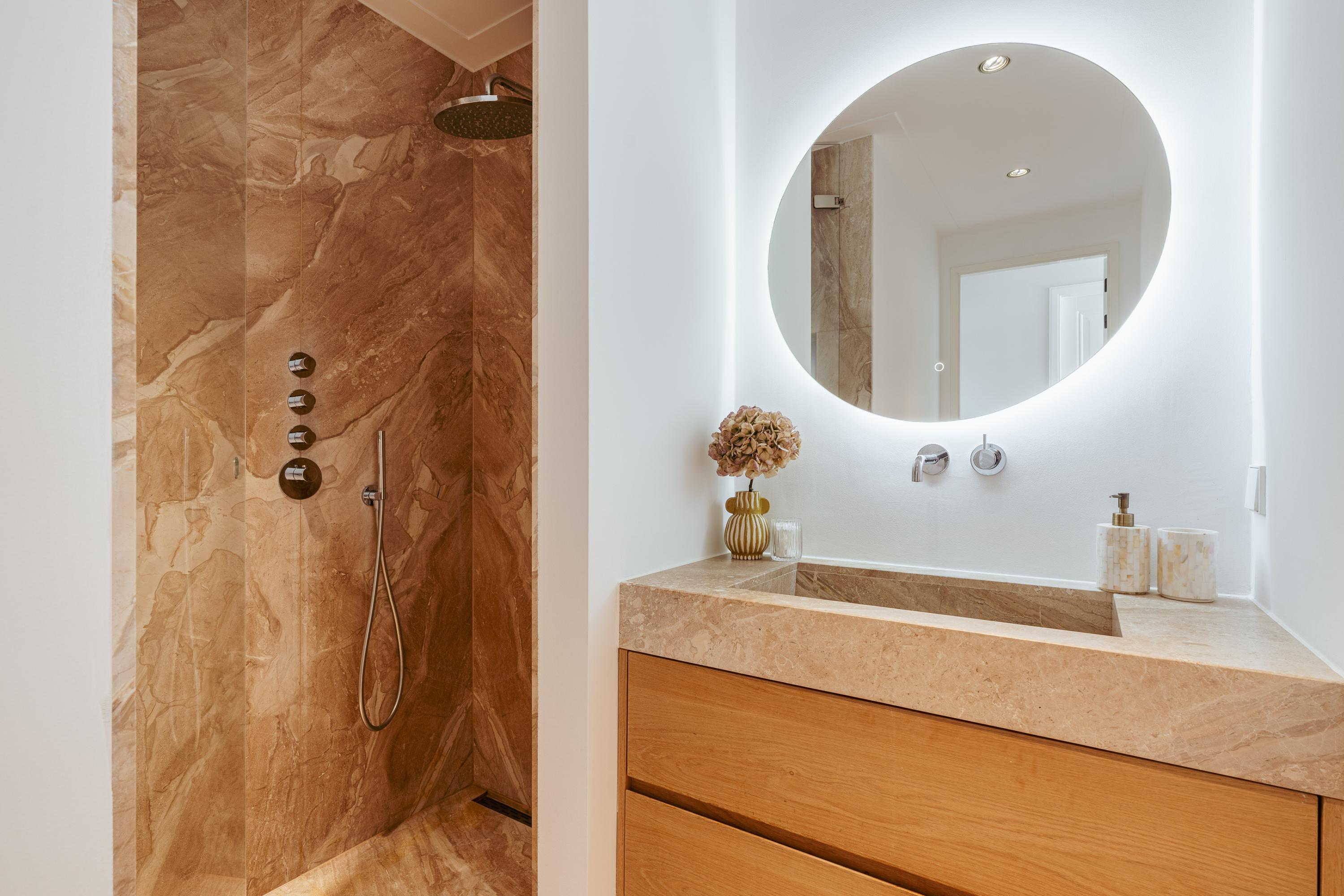 正面两间卧室配备贴心收纳,主卧设有带集成照明的胡桃木嵌入式衣柜。浴室选用对纹云石纹理的洞石,配置雨淋花洒与定制梳洗台,独立卫生间延续天然石材色调。全屋铺设橡木人字拼地板,地暖延伸至每一空间,温暖舒适。实用洗衣房及储藏空间为日常生活增添便利。
