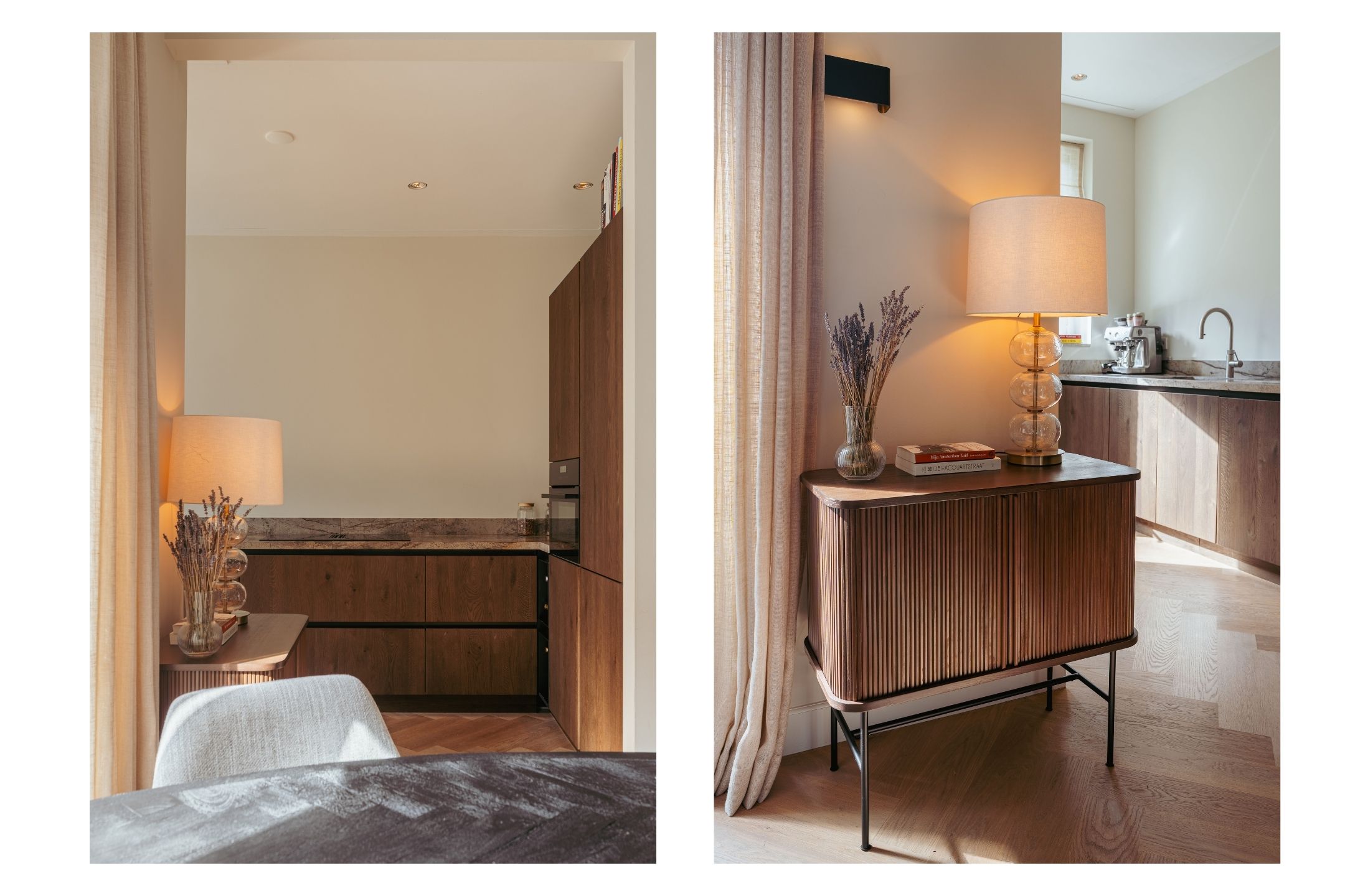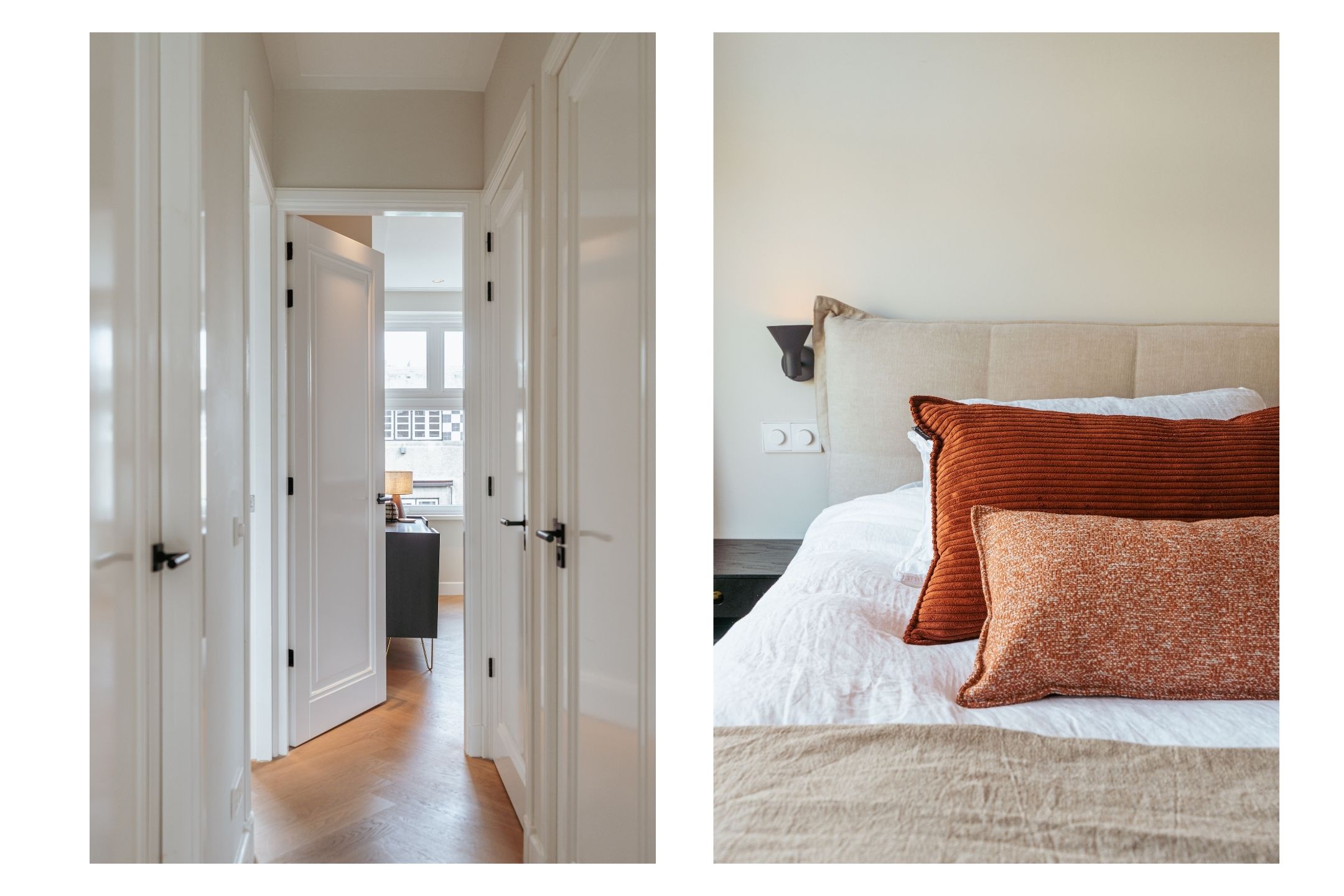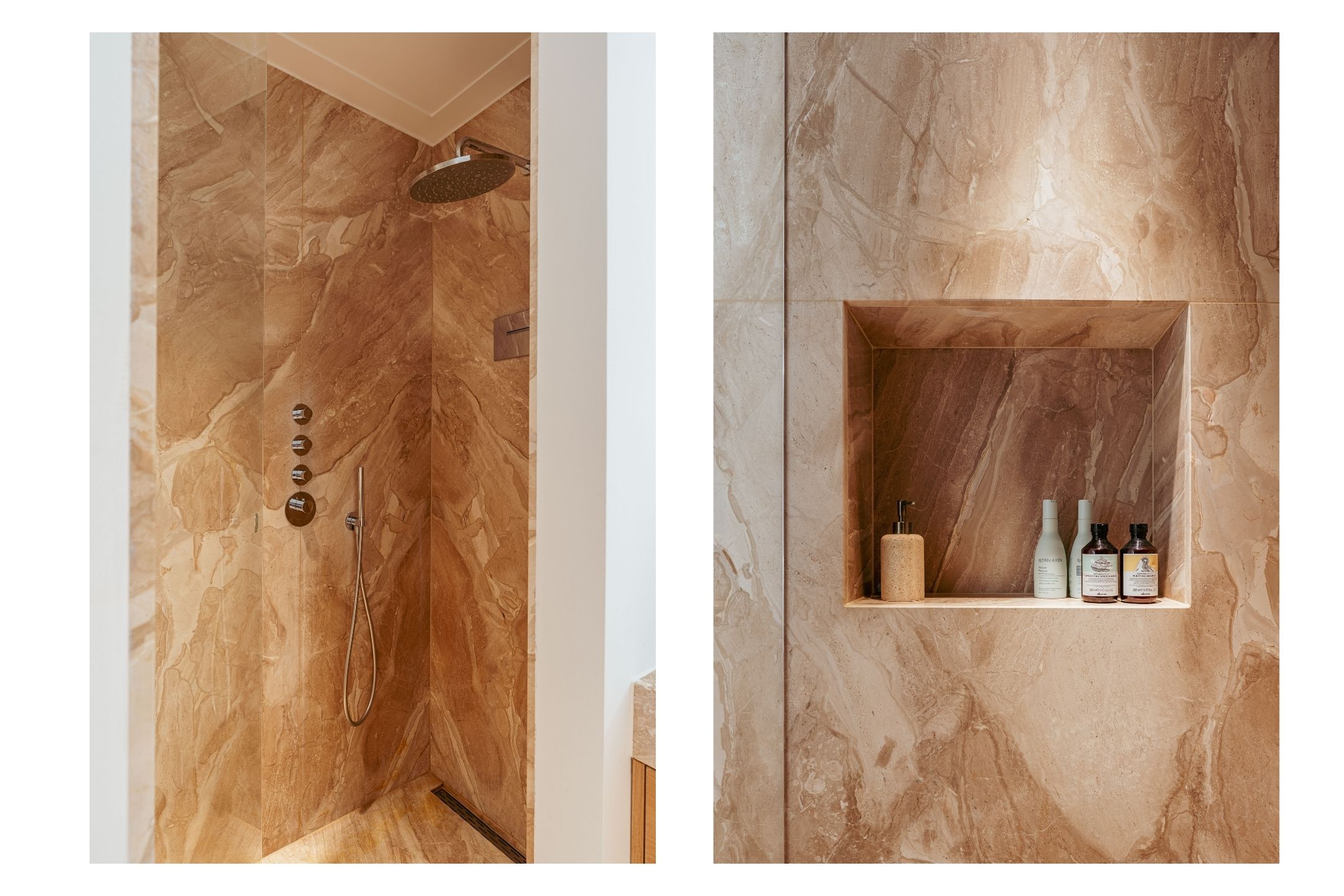正面两间卧室配备贴心收纳,主卧设有带集成照明的胡桃木嵌入式衣柜。浴室选用对纹云石纹理的洞石,配置雨淋花洒与定制梳洗台,独立卫生间延续天然石材色调。全屋铺设橡木人字拼地板,地暖延伸至每一空间,温暖舒适。实用洗衣房及储藏空间为日常生活增添便利。