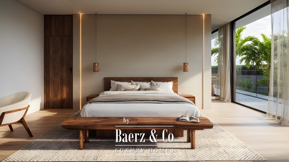 The main floor opens onto the garden through a large living-dining room with an integrated designer kitchen, fully equipped and connected to the outside area. Large full-height windows allow a perfect fusion between interior and exterior, giving way to the covered porch, the private pool and the chill-out area. On this level there is also a guest bedroom with its own bathroom and a guest toilet.