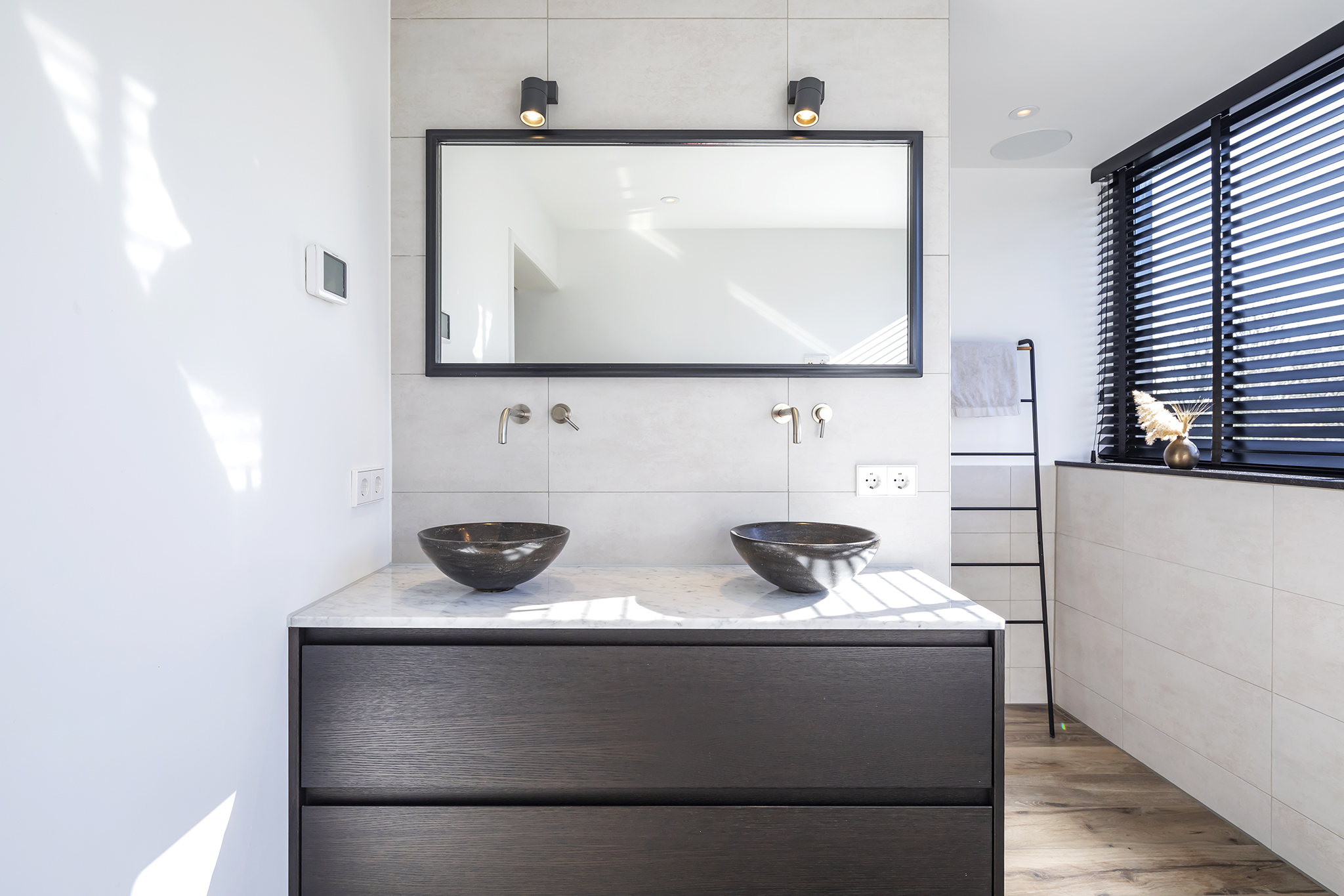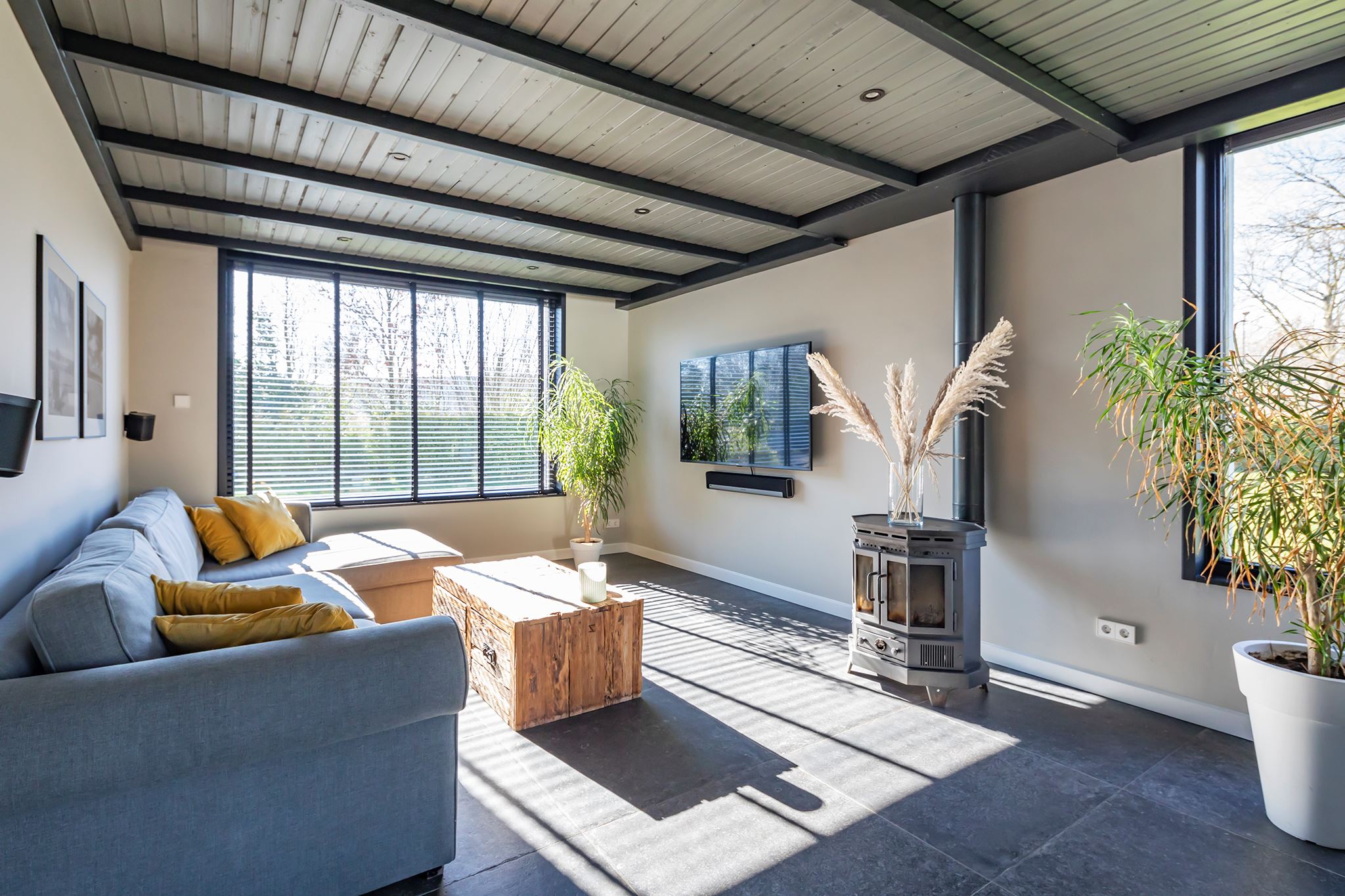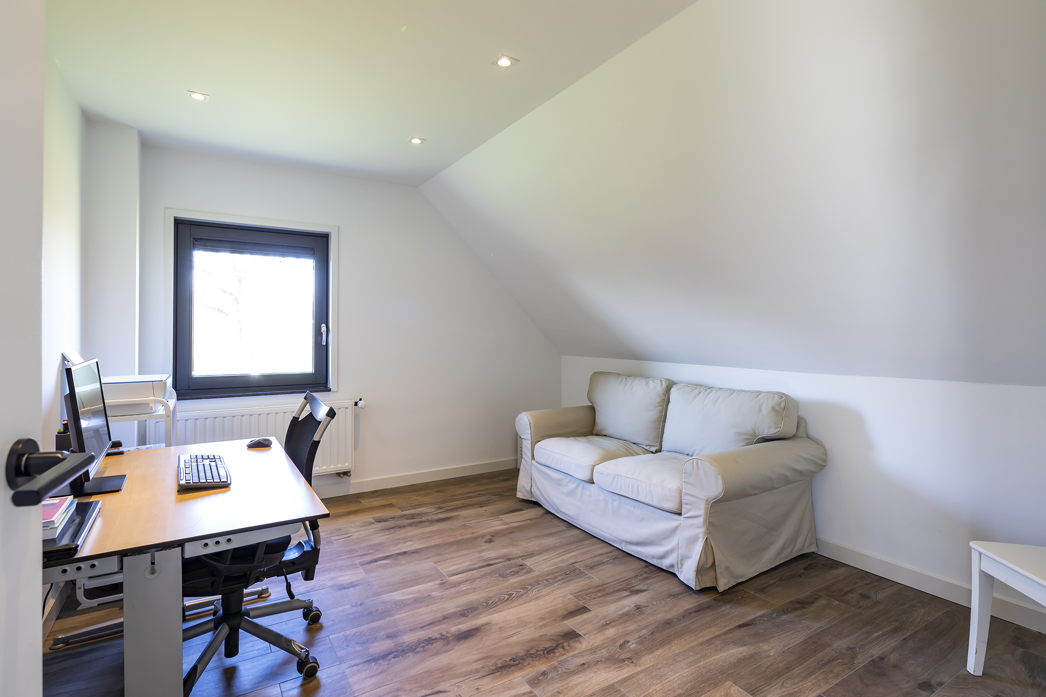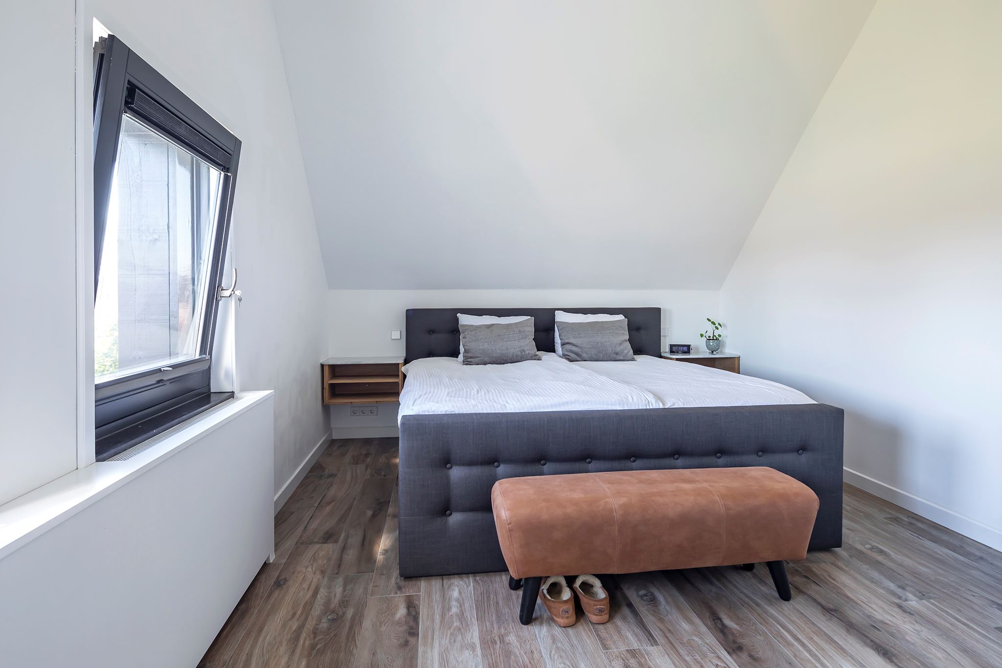 楼上分布三间卧室,主套房配有花园景观及步入式衣帽间,浴室设转角浴缸、步入式淋浴和天窗自然采光。隔热且供暖的地下室可作为家庭影院或办公空间灵活使用。实用细节包括28平方米储藏室、宽敞车棚、A级能效、23块太阳能板、光纤网络、HR++玻璃及全屋保温。地理位置兼备静谧与便捷,轻松畅达奥斯特韦克各项配套及Kampina自然保护区。