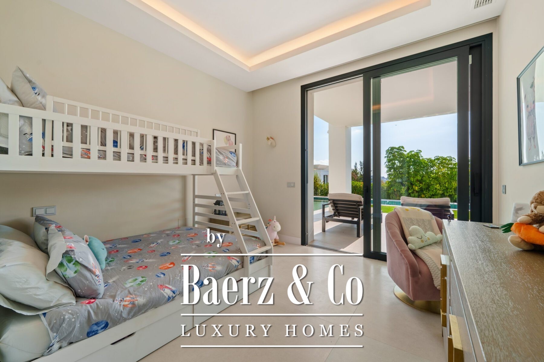 户外以宽敞的游泳池为中心,配备可伸缩泳池盖,环绕着阳光露台和多处有顶休息区。泳池一侧设有带壁炉的休闲区、户外厨房及用餐空间,全年营造轻松而雅致的待客氛围。六间卧室和五间浴室保证了私密与舒适,每间卧室均配专属露台及现代化装修。