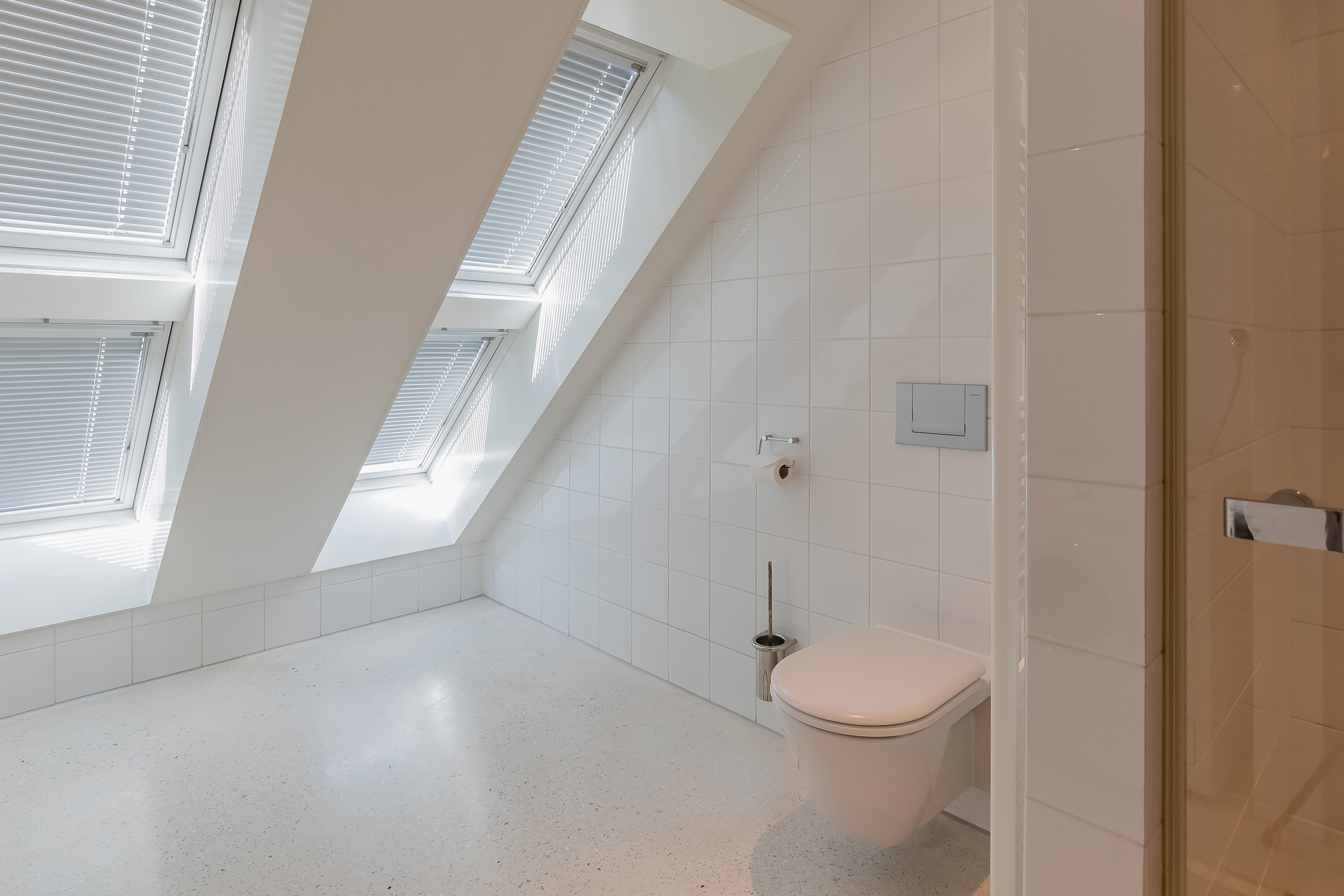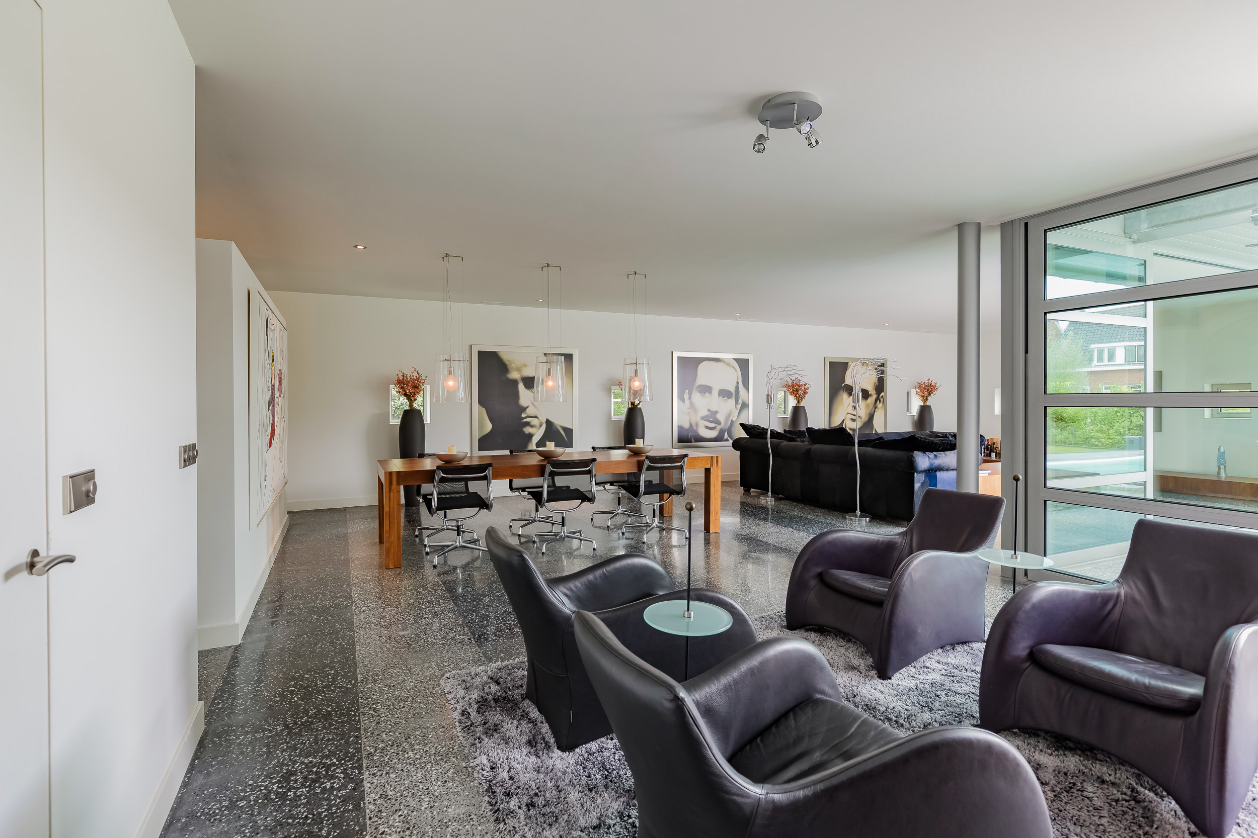 对称美学贯穿整个空间设计,从明亮入口大厅中引人注目的玻璃楼梯,到18米长大客厅及适合盛大宴请的餐区。厨房以流畅线条与高端电器为特色,静谧地划分主起居空间。室内的水磨石地面配备地暖,与露台无缝衔接,将内饰延伸至西南朝向的花园,巧妙映衬温水游泳池和水域边界。