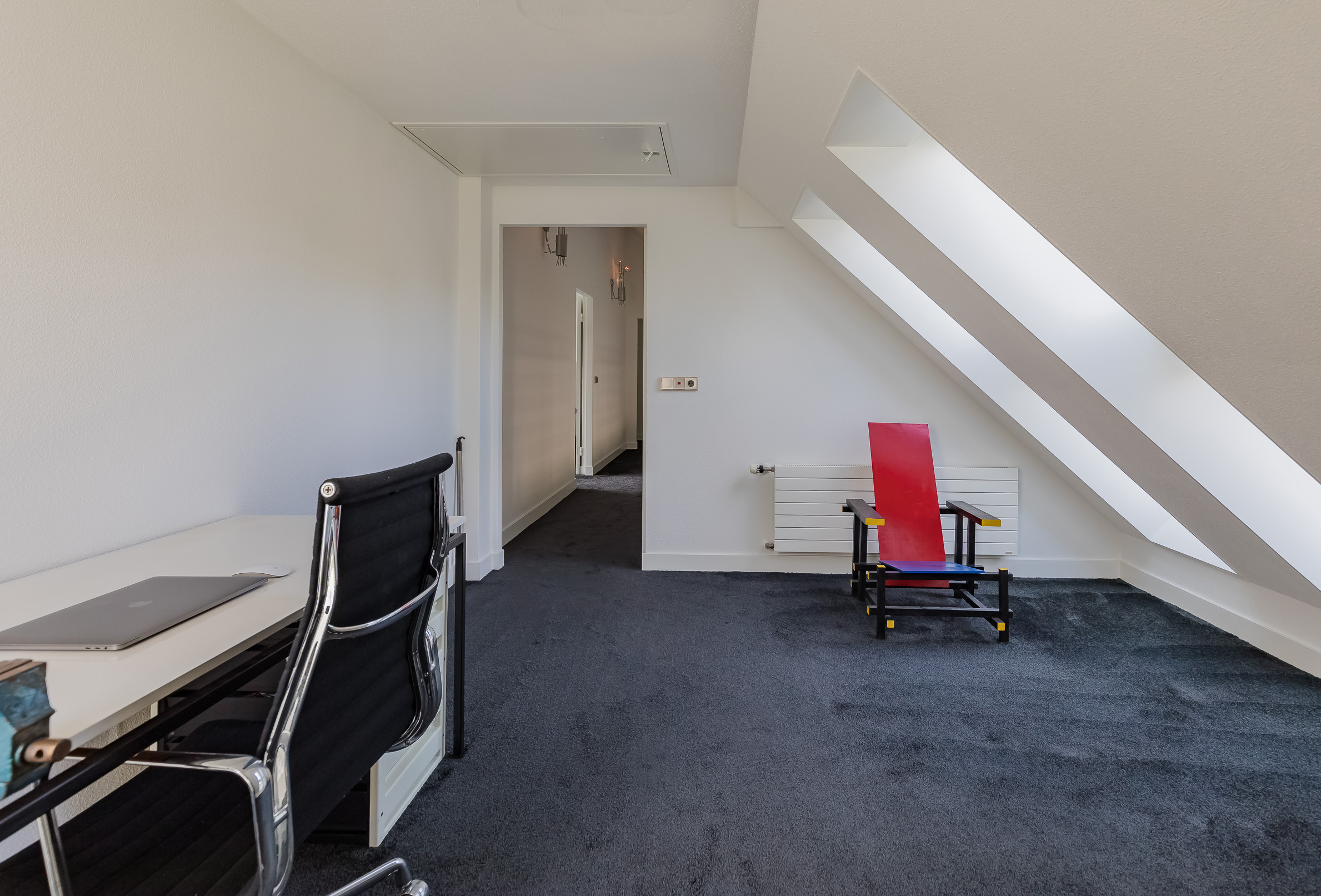 别墅二楼设有三间卧室,包括配备私人阳台、更衣室及独立卫浴的主套房。二十处天窗为楼上空间引入充沛自然光,一楼书房可灵活用作居家办公。安保系统采用3级警报、门禁与周界监控摄像头,全面保障安全。