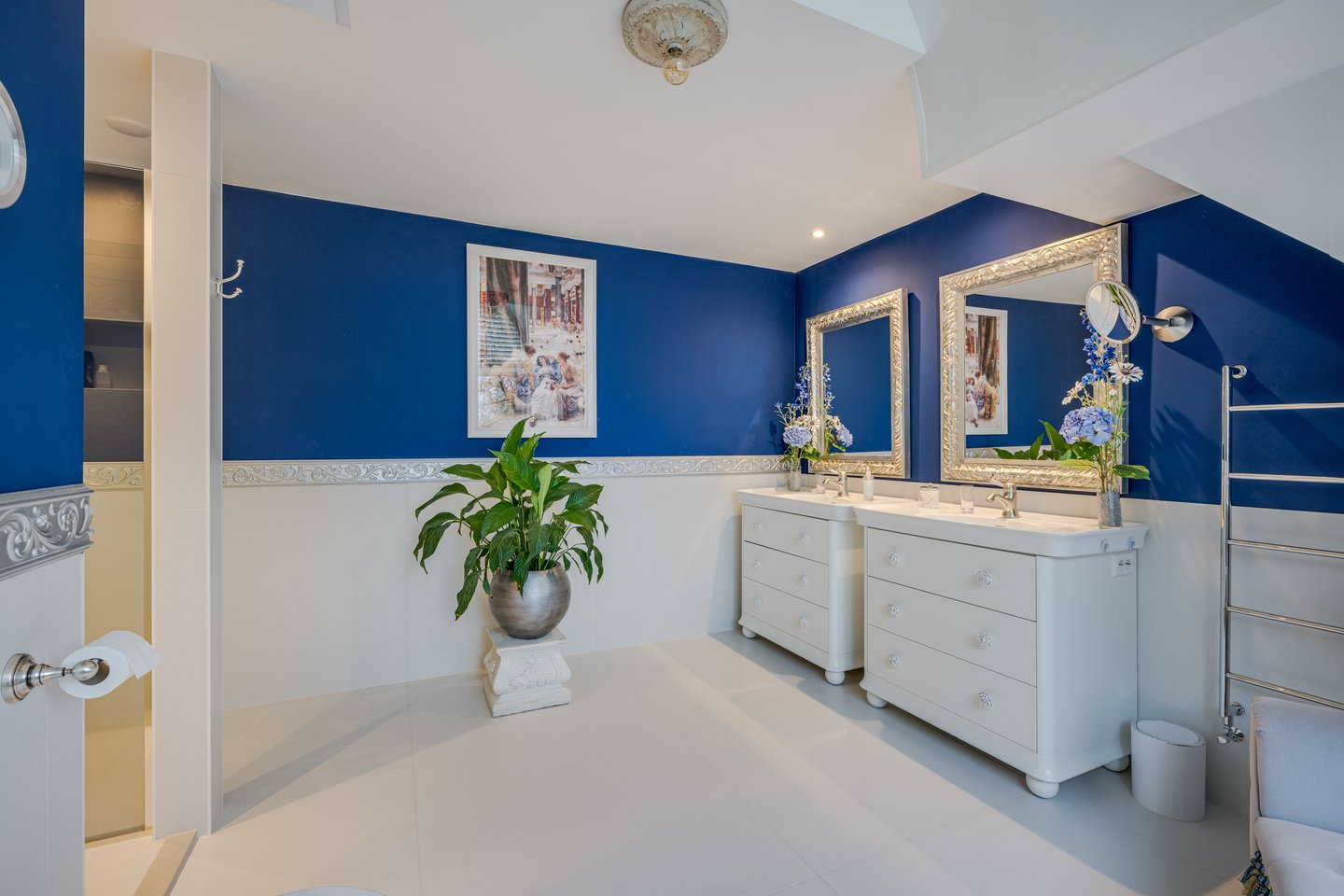 别墅内部以宽敞的门厅为起点,引向通透明亮的客厅。大面积落地窗与法式双开门,将花园与水景尽收眼底,并配有燃气壁炉与地暖系统贯穿整个底层。厨房兼具操作与社交功能,相连车库配有电动门及专属设施接口。楼上三间卧室和配备地暖与步入式淋浴的2022年奢华卫浴形成私密空间。步入式衣帽间和宽敞阁楼增加了灵活性,未来可轻松增设第四间卧室。